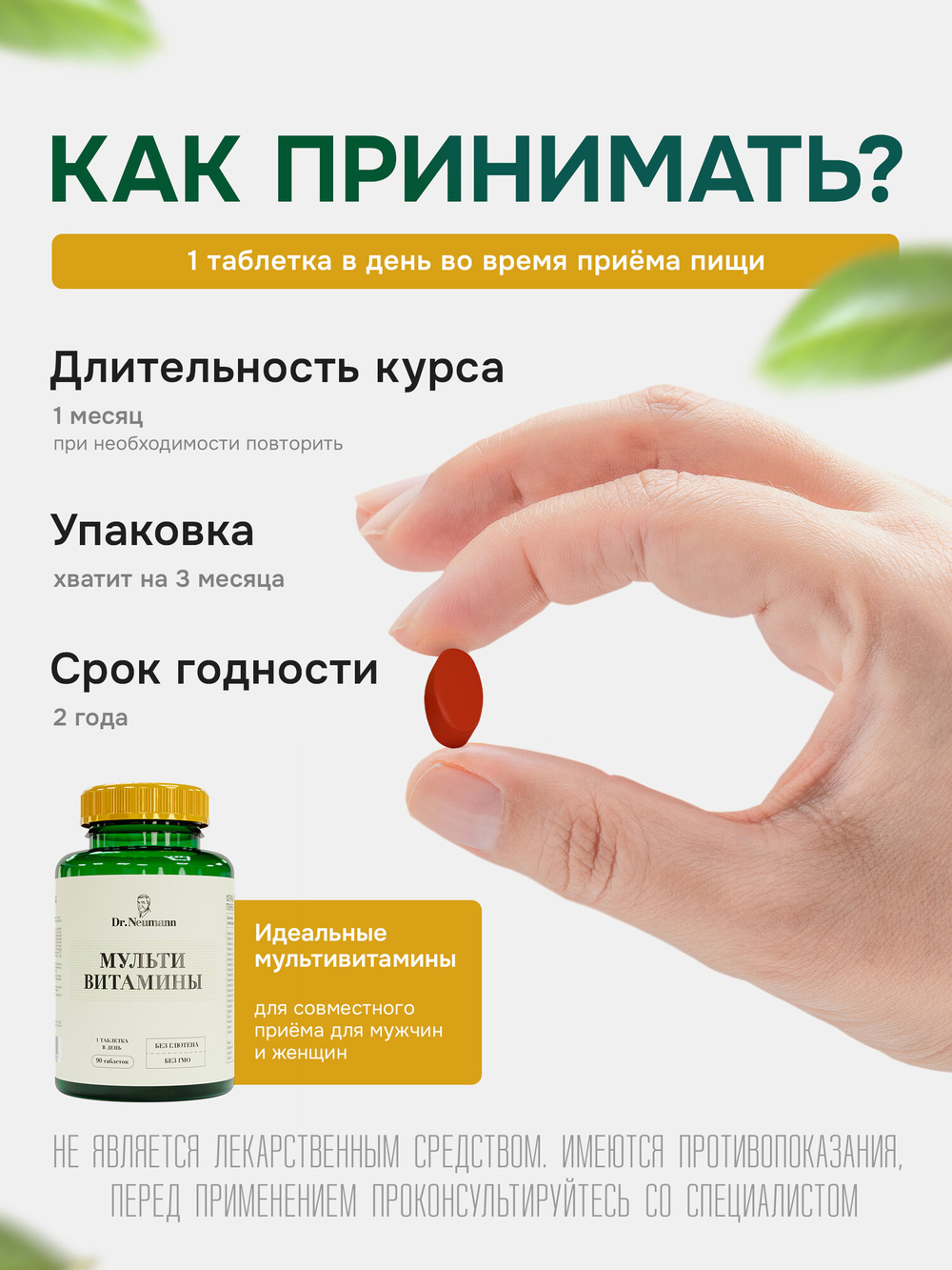 Принимайте по одной порции (1 таблетка) 1 раз в день во время приема пищи, или в соответствии с вашей индивидуальной программой питания или рекомендациями врача. Продолжительность приема 1 месяц. При необходимости прием можно повторить.Состав, пищевая ценность