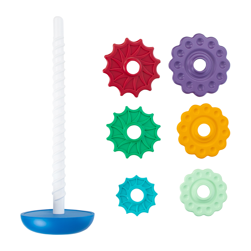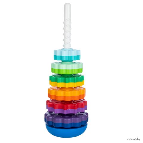 Пирамидка с голубым кольцом наверху. Развивающая пирамидка, состоящая из 6 двойных колец разного цвета, которые при кручении по стирали увлекают радужными переходами.
