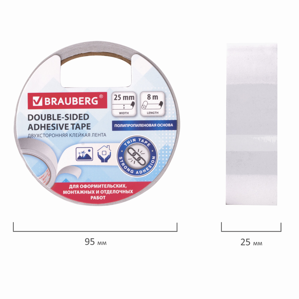 Двухсторонняя клейкая лента на основе полипропилена используется для склеивания гладких поверхностей при проведении оформительских, монтажных и отделочных работ.
