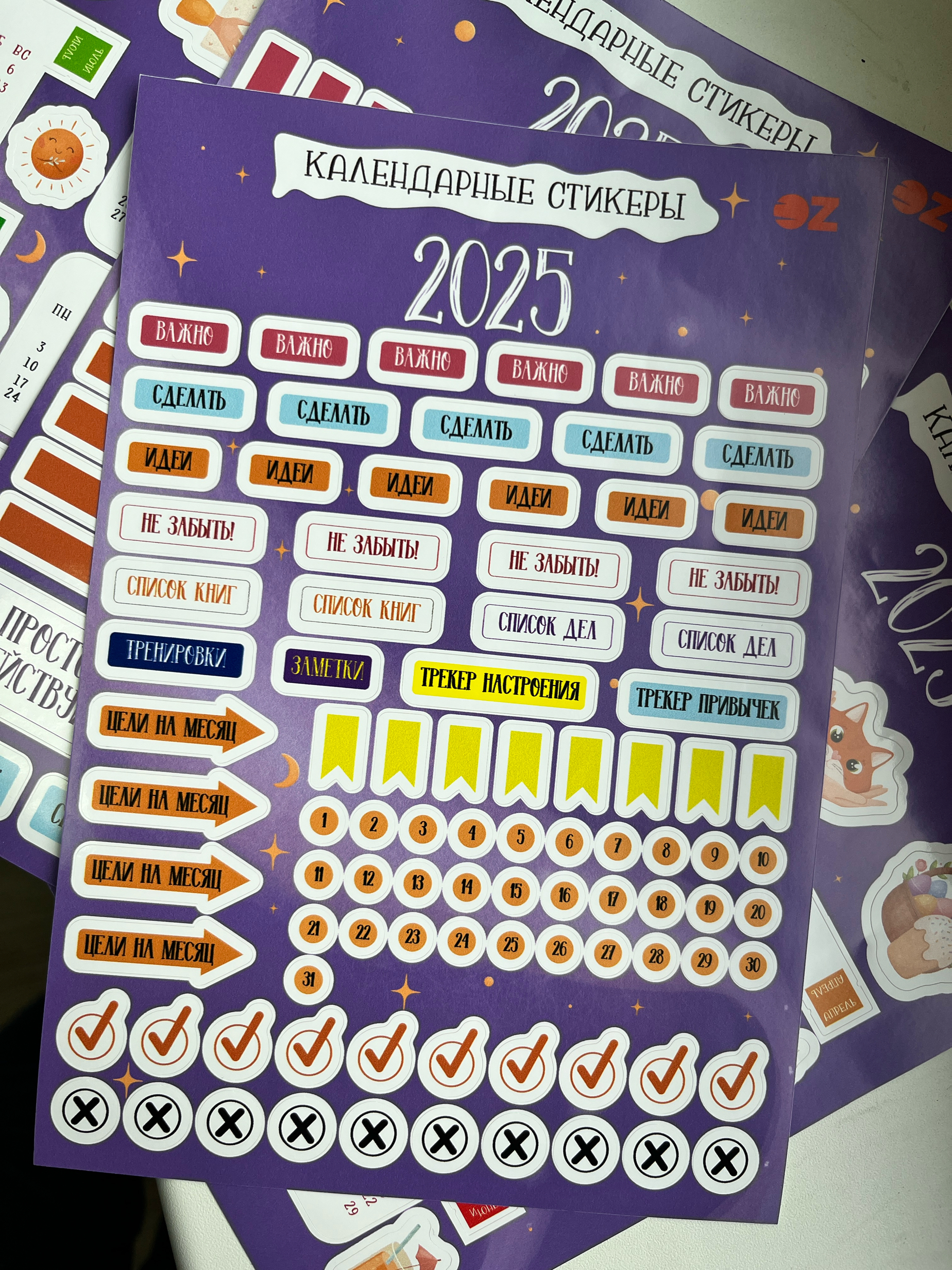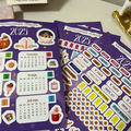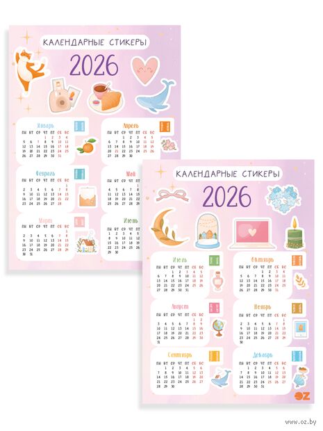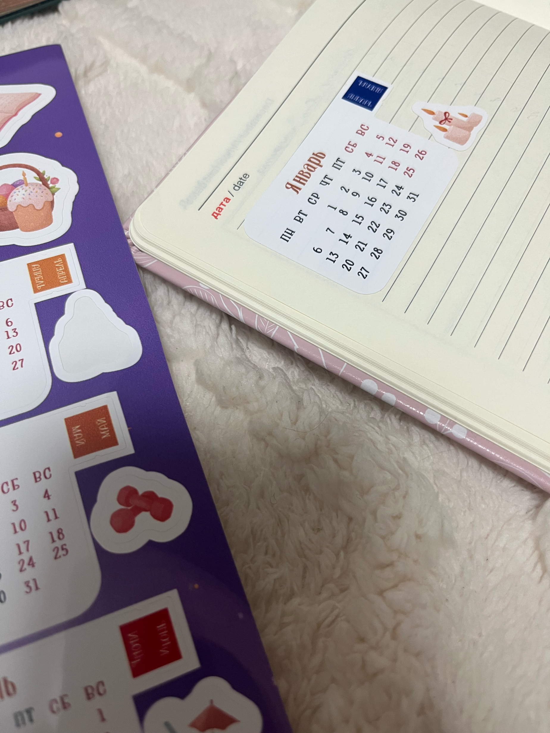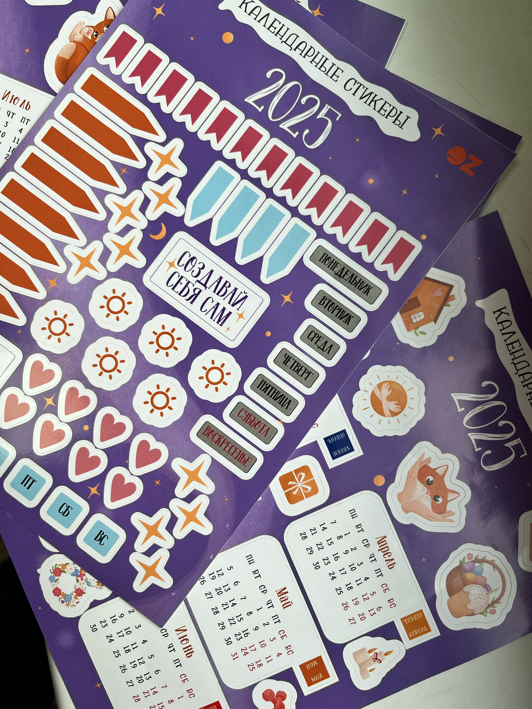 В наборе 4 листа размером 14,8х21 см каждый. 2 листа содержат календарные месяцы и соответствующие сюжетные наклейки. 2 листа со стикерами для обозначения задач, важных дел и встреч.