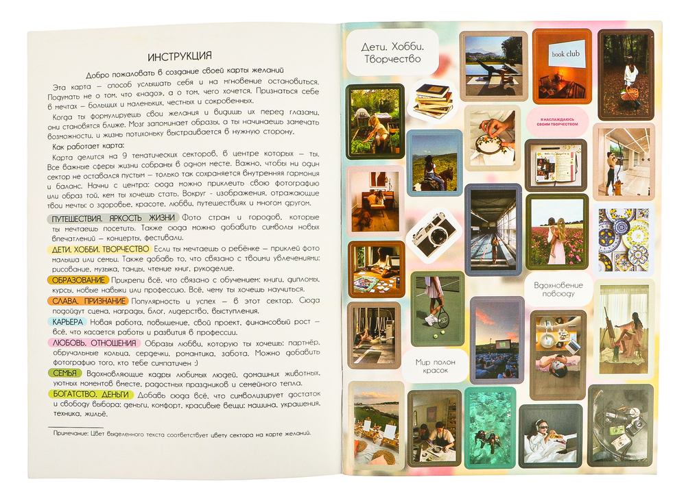 Создавая собственную карту желаний, вы фокусируетесь на том, что действительно важно именно для вас. Смотрите на неё каждый день, вдохновляйтесь и двигайтесь вперёд. Карта станет связующим звеном между вашим подсознанием и настоящими стремлениями.