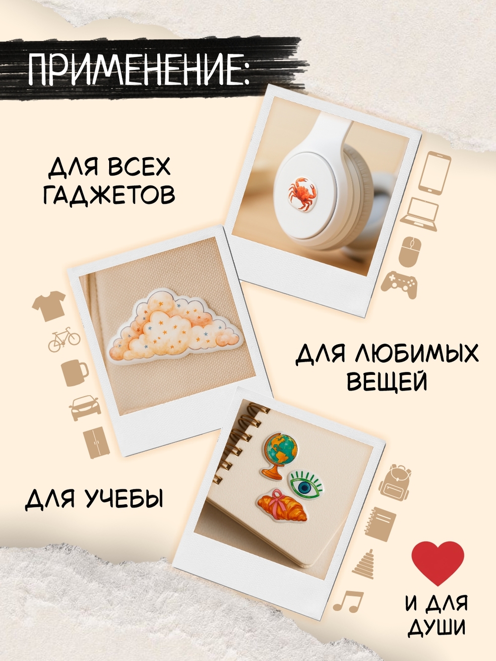 Легко отклеиваются и наклеиваются, не оставляют следов, с яркими цветами, четким рисунком и великолепным качеством печати. Подчеркните свою индивидуальность, наклеив прикольные стикеры на телефон, чехол, банковскую карту, блокнот, ноутбук, холодильник, автомобиль, мотоцикл, велосипед или гитару.