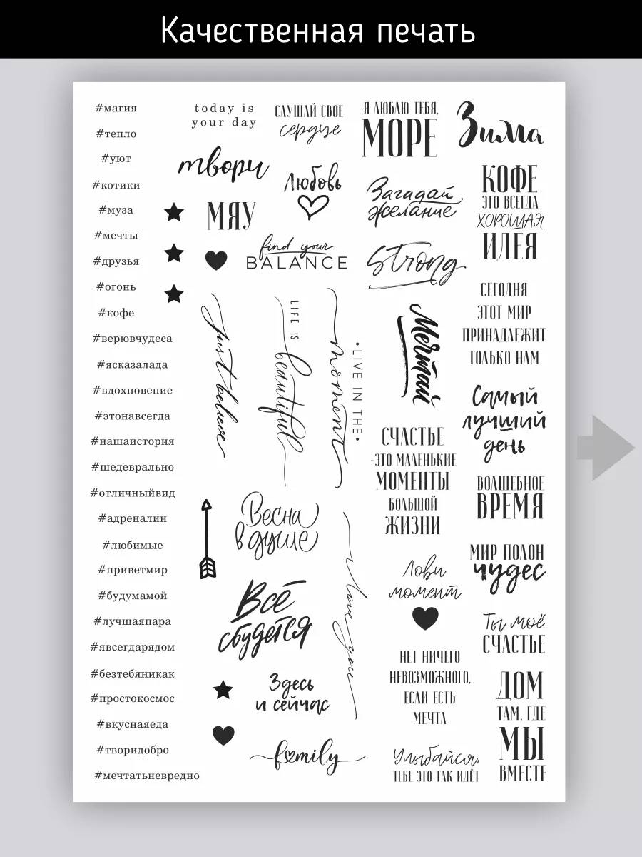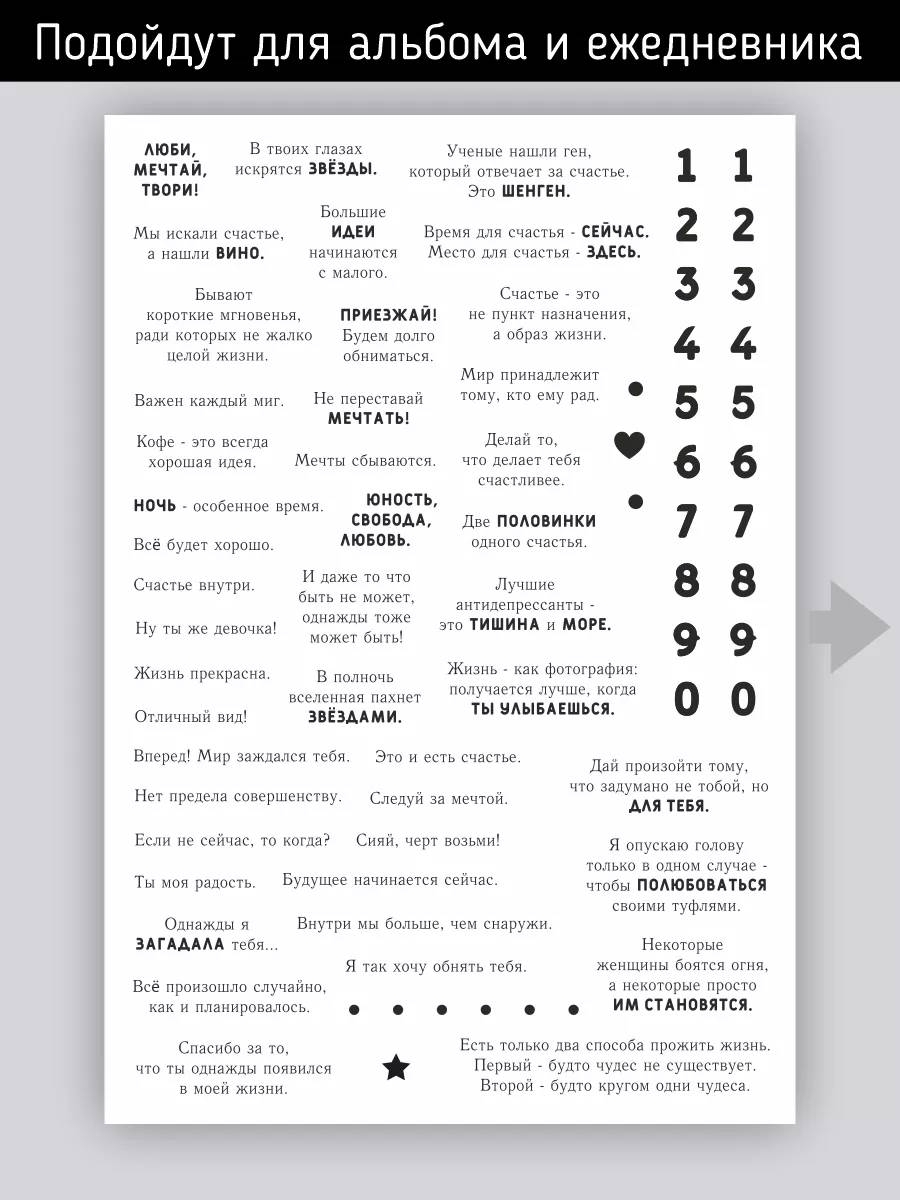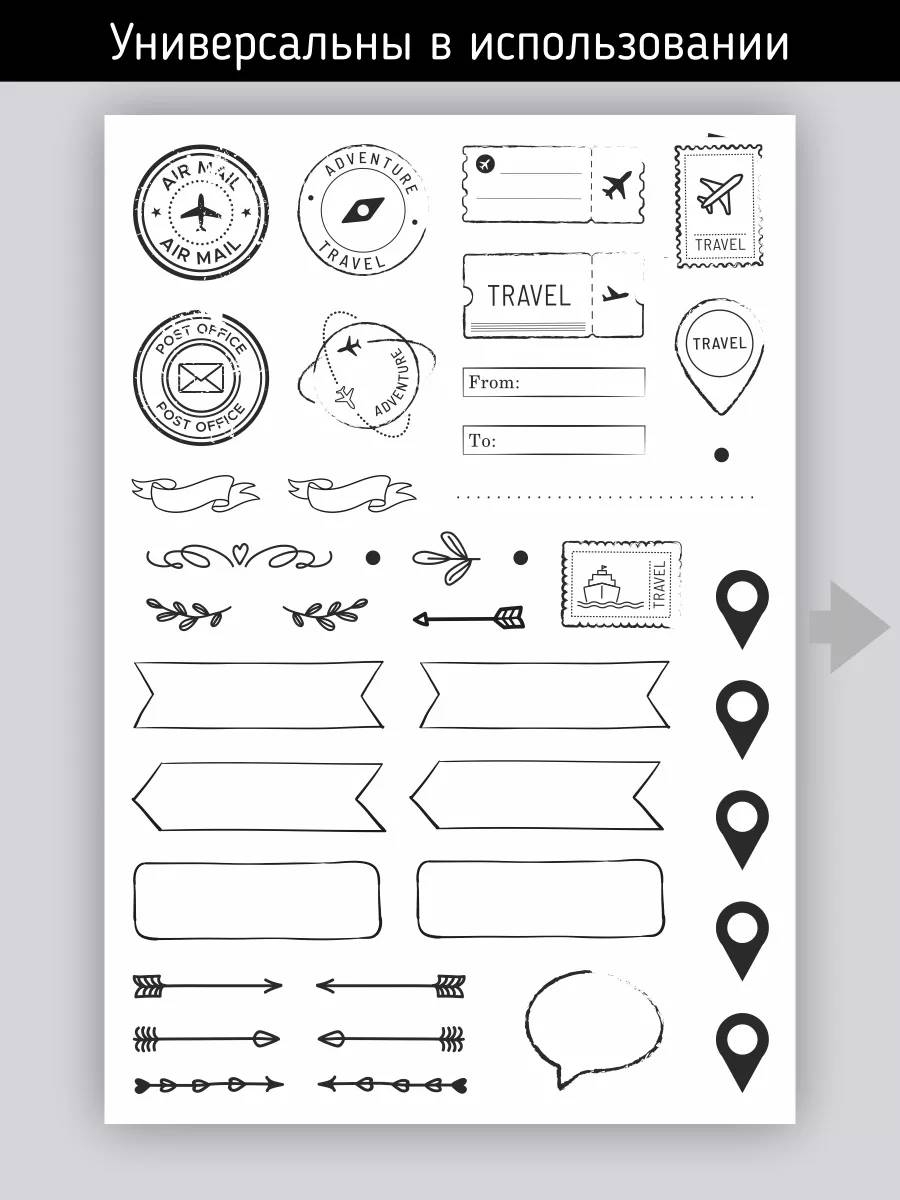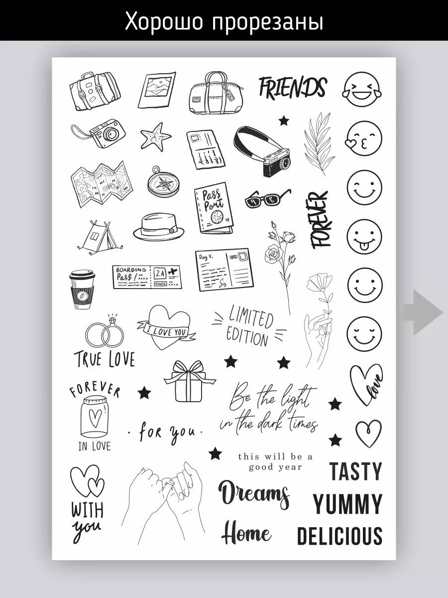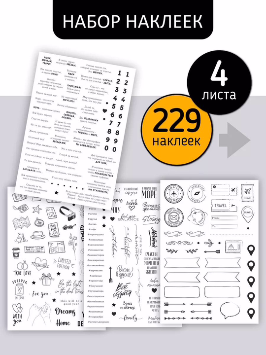 В набор входят 4 листа черно-белых наклеек универсальной тематики: звезды, сердце, смайлики, вдохновляющие надписи, подарок, штампы путешествий, трекеры, цифры, буквы, алфавит и многое другое.