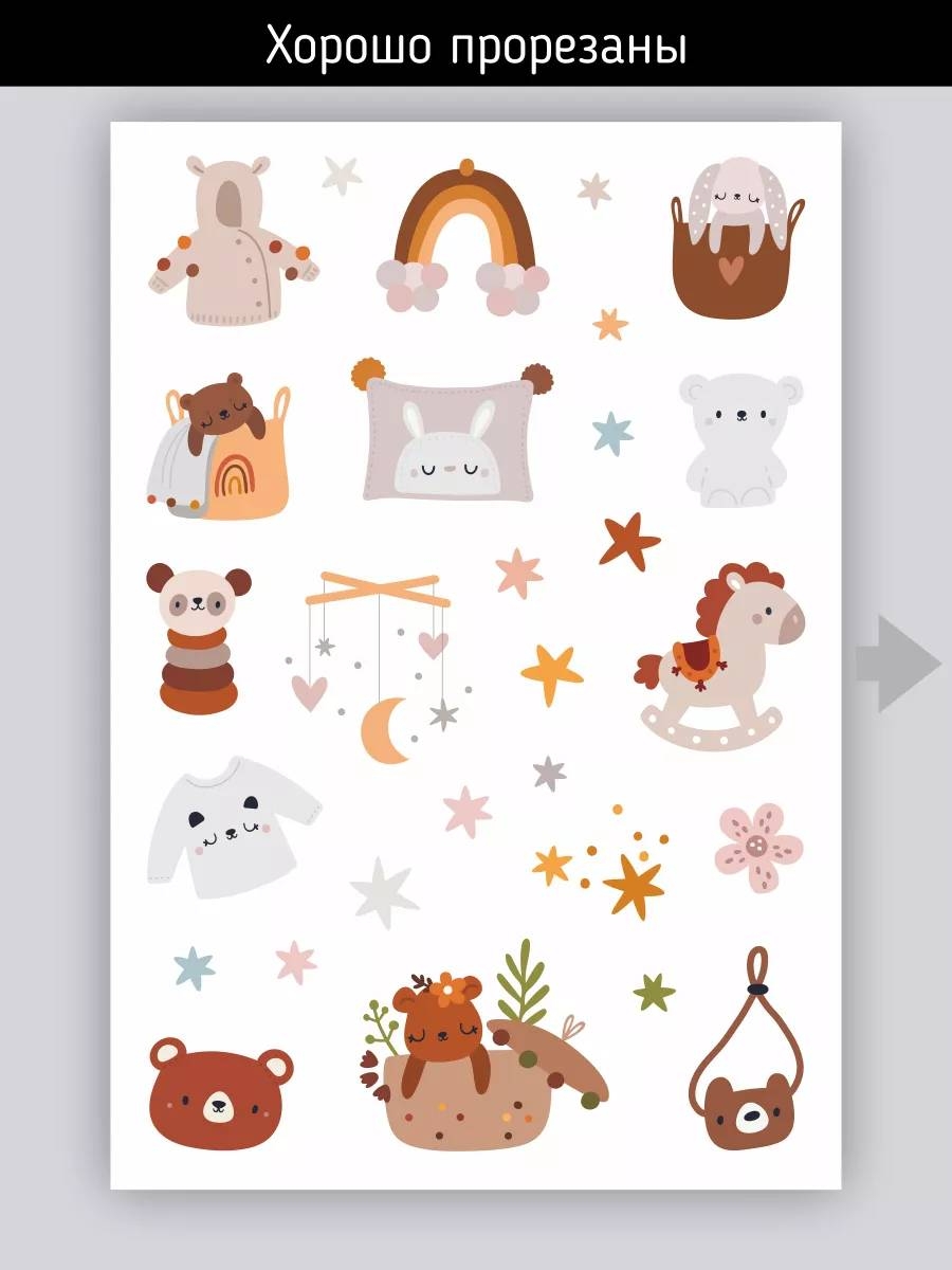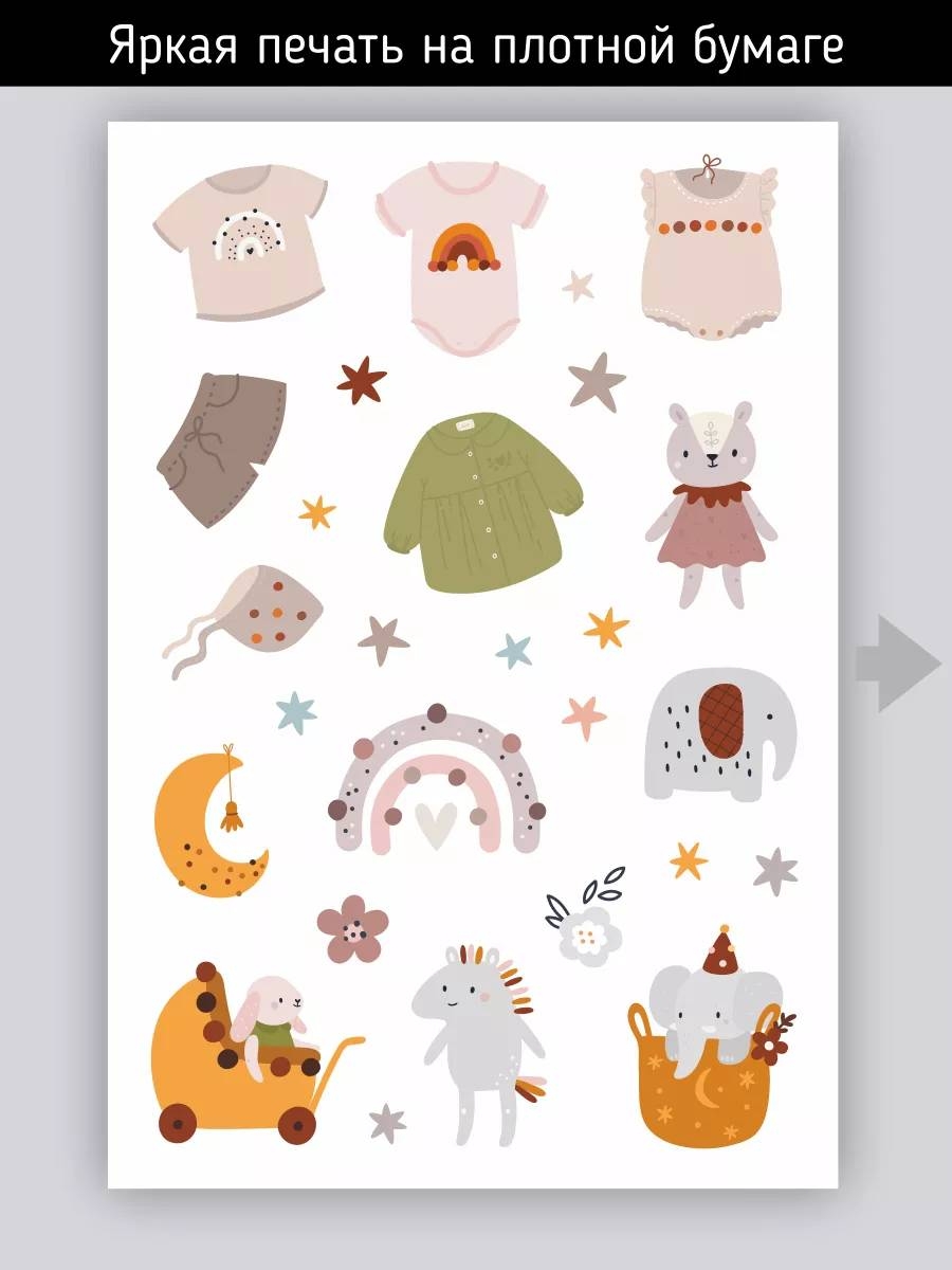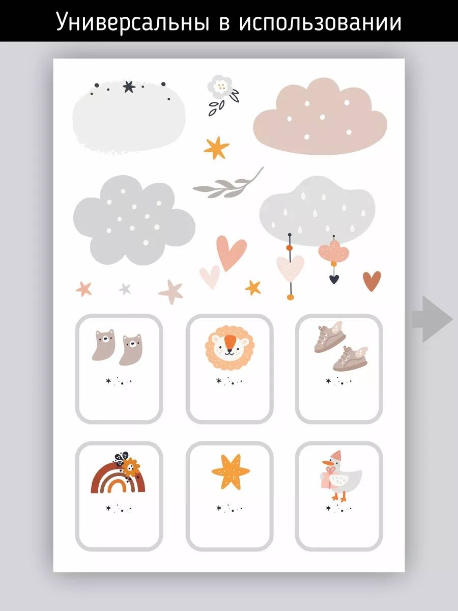 В набор входят 4 листа наклеек детской тематики: звезды, сердце, радуга, малыш, детская одежда, игрушки, цветы, зайчик, мишка, трекеры по месяцам, буквы, алфавит и многое другое.