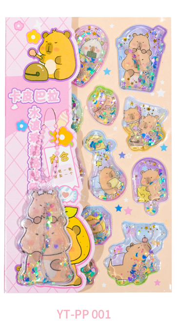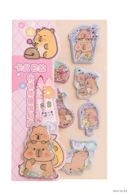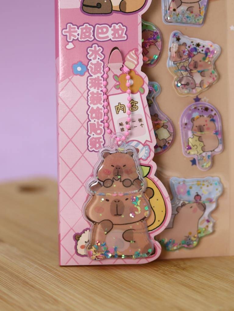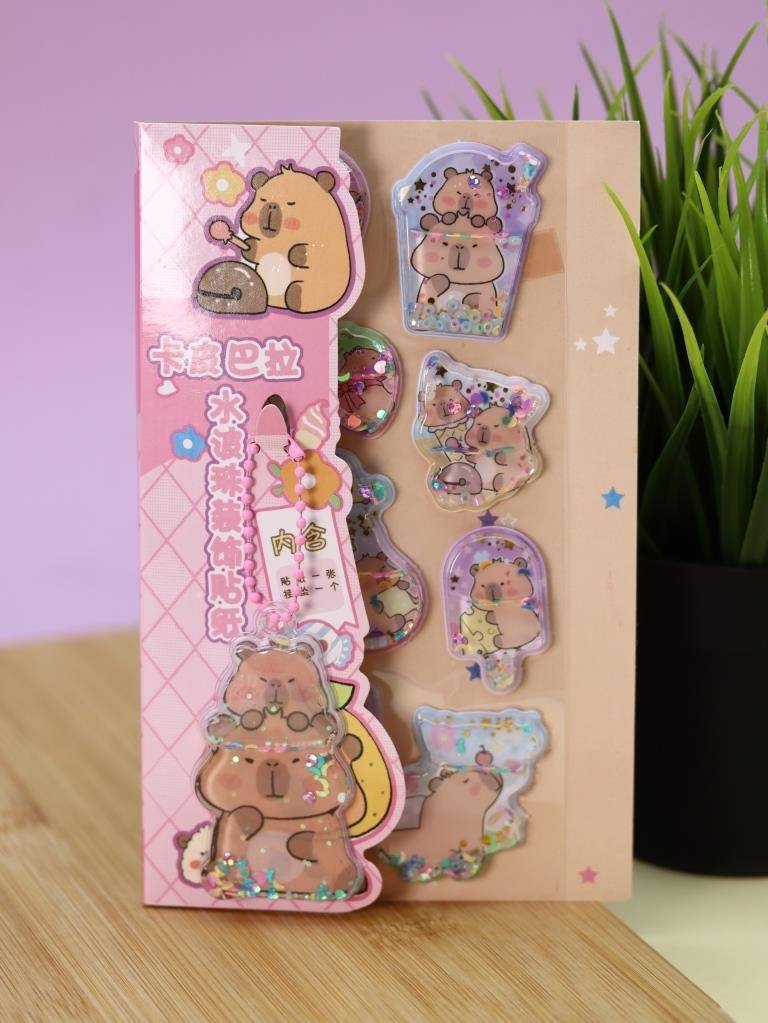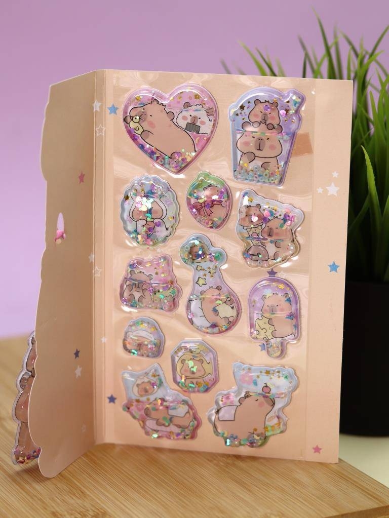 В комплект входят объёмные гелевые наклейки с изображениями капибары, наполненные яркими блёстками, которые красиво переливаются при движении.