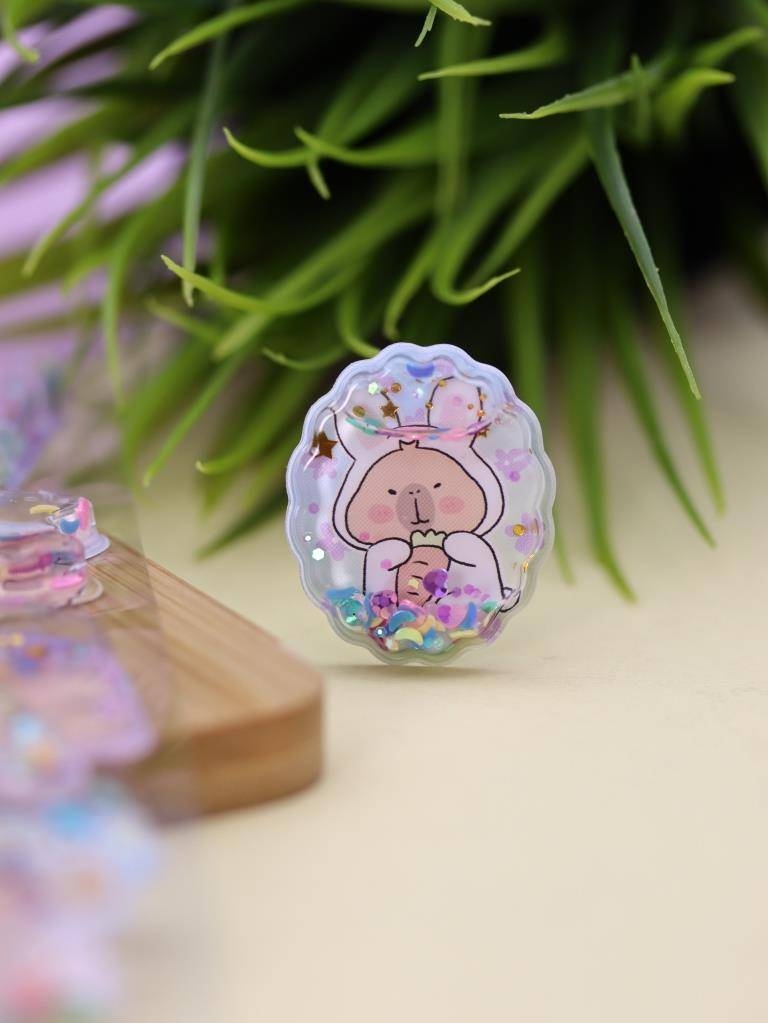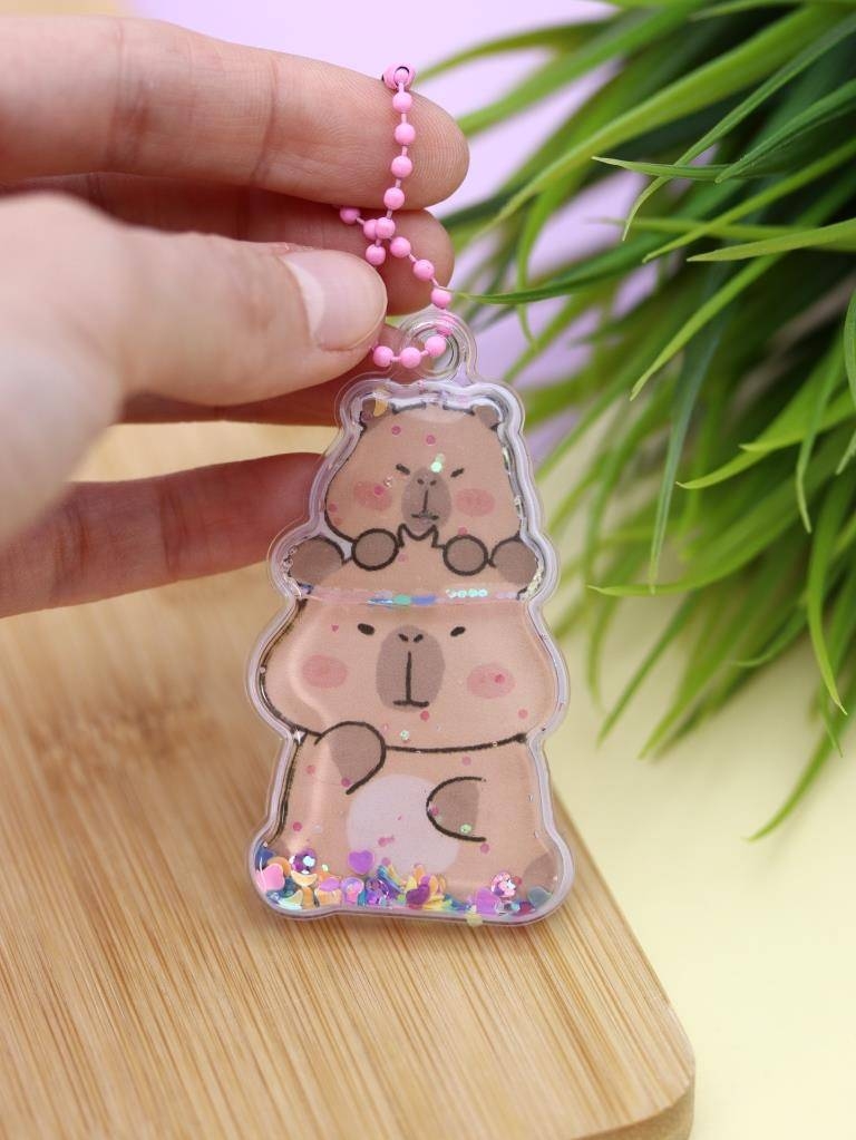 В набор также входит фигурный брелок в виде капибары с жидкостью и блёстками внутри, подвешенный на розовой цепочке – идеальный аксессуар для рюкзака, сумки или ключей.