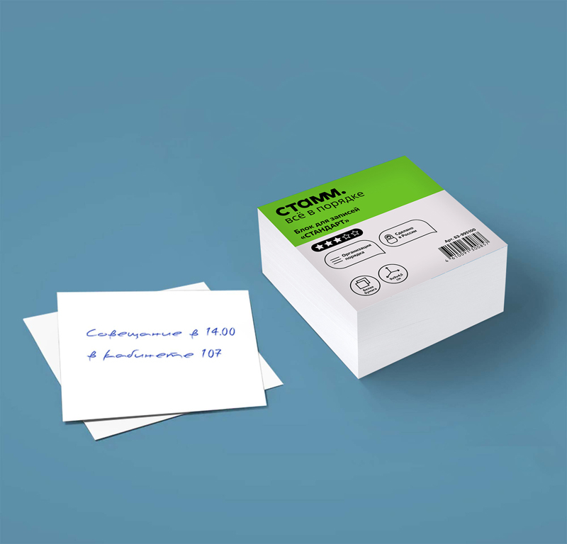 Блок для записей представлен в индивидуальной упаковке в термоусадочной плёнке.