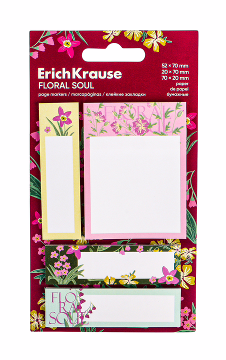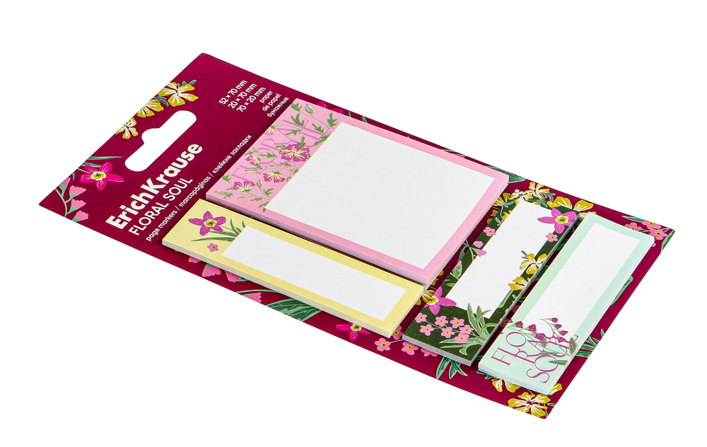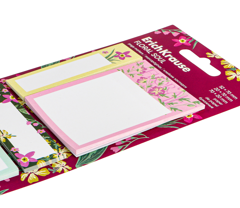 Клейкие закладки бумажные ErichKrause представлены в коллекции Floral Soul с дизайном коллекции. Клейкие закладки бумажные удобны для выделения страниц и записи коротких сообщений, а также подчеркнут вашу индивидуальность за счет рисунка коллекции Floral Soul.