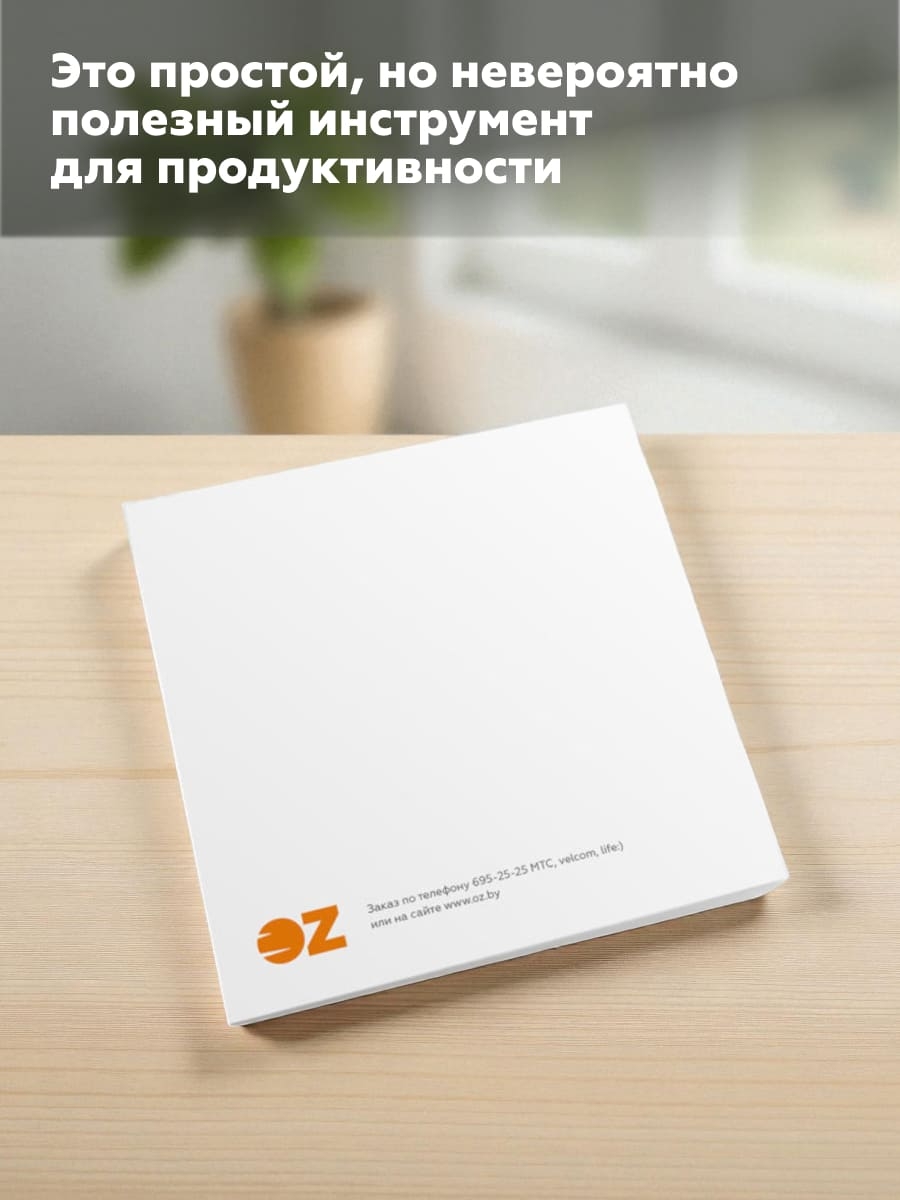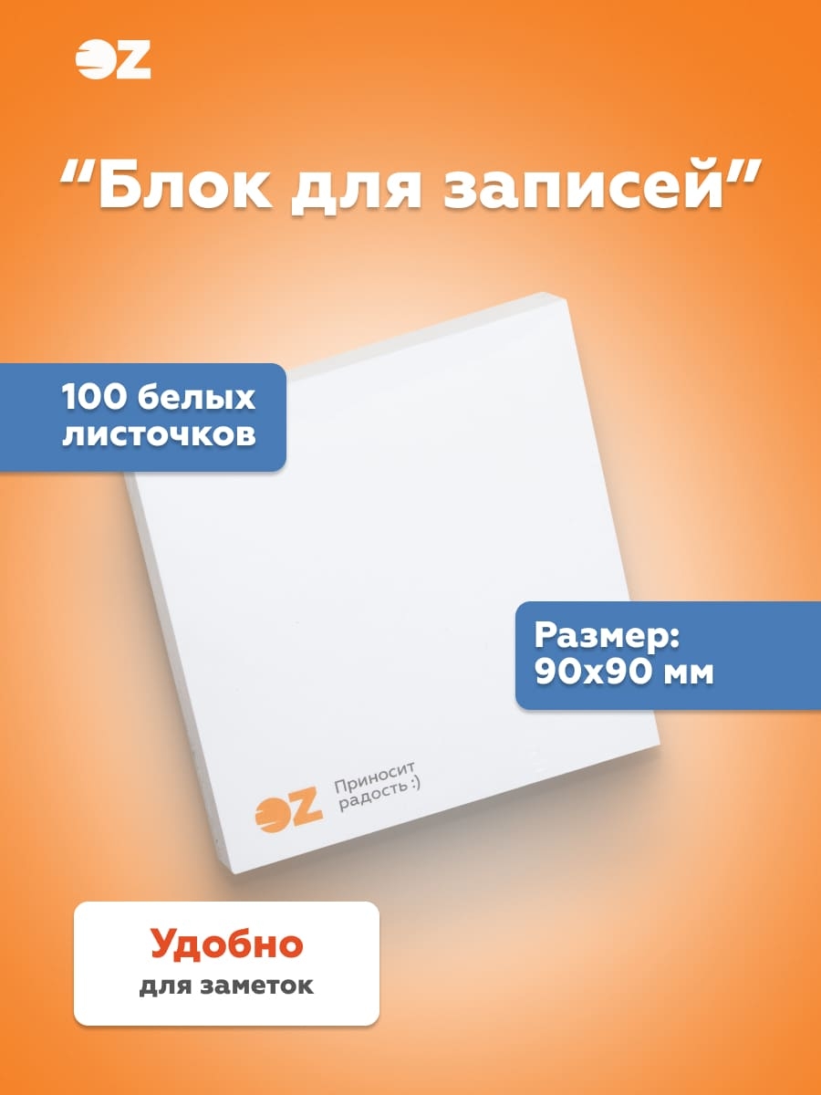 В пачке – 100 белых листочков с логотипом OZ. Их хватит надолго, чтобы делать срочные записи, которыми нужно поделиться с кем-то или перенести потом в свой блокнот.