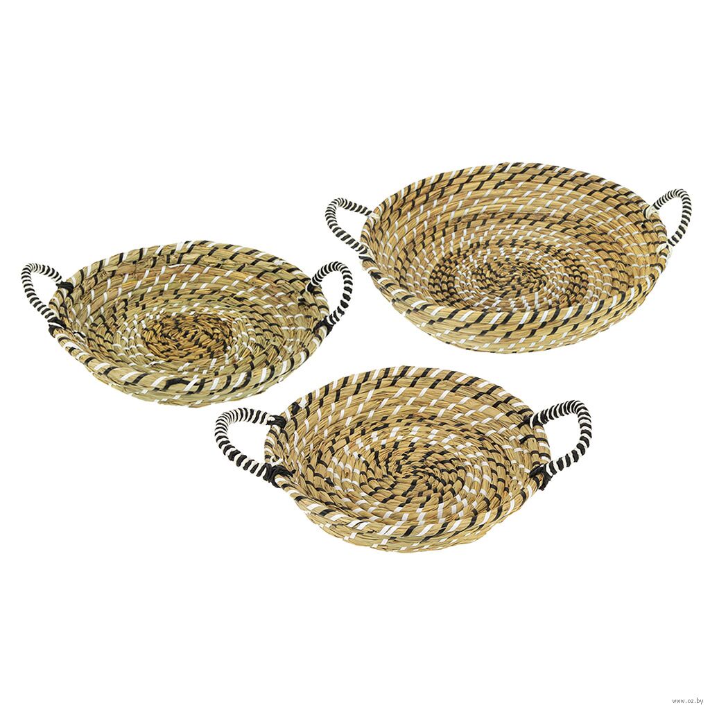 Набор состоит из 3 плетеных корзин разного размера: 43х9 см, 38х8 см и 33х6 см.