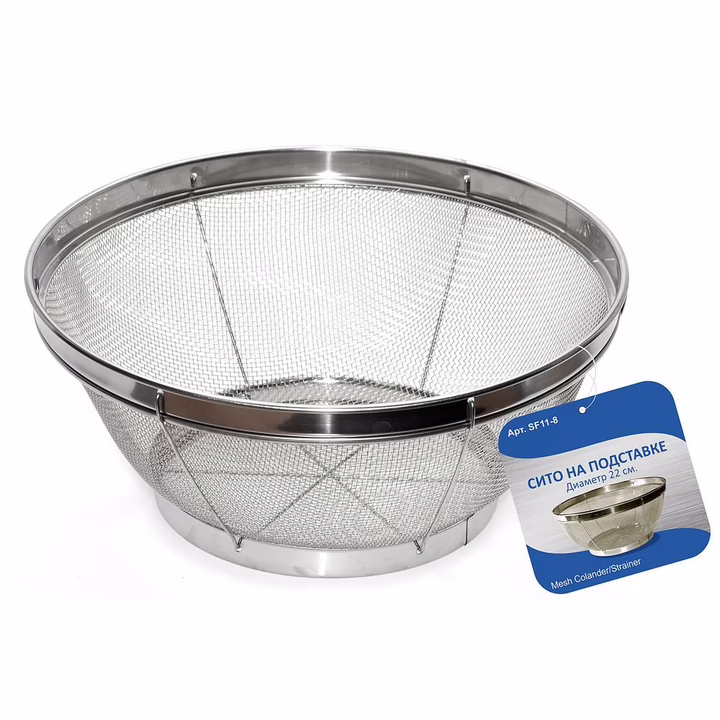 Универсальное приспособление – сито на подставке используется для мытья овощей и фруктов под краном, промывания круп и макаронных изделий. Также, как и обычное сито, эта модель идеально справляется с процеживанием компотов, морсов, чаёв и других жидкостей. Сито изготовлено из нержавеющей стали с прочным каркасом и подставкой для устойчивости изделия. Материал долговечен, не портится под воздействием влаги, не образует коррозии. Такое приспособление станет хорошим помощником на кухне.