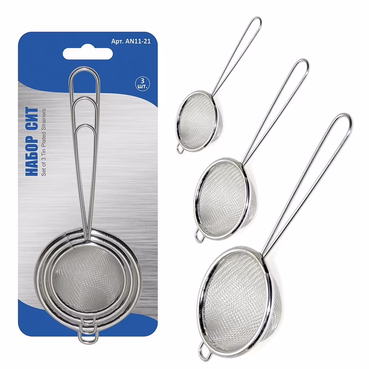 На кухне постоянно приходится что-то процеживать, ополаскивать, для этого очень удобно пользоваться ситом, а ещё лучше – набором из трёх сит. Ситечки разного диаметра подойдут для разной посуды, через одни удобно процеживать чай в кружку, в других промывать сухофрукты. Сита сделаны из стальной сетки с хромированным покрытием, оснащены удобной ручкой, за которую можно подвесить изделие на крючок. Размеры: диаметр 7,8 и 9 см.