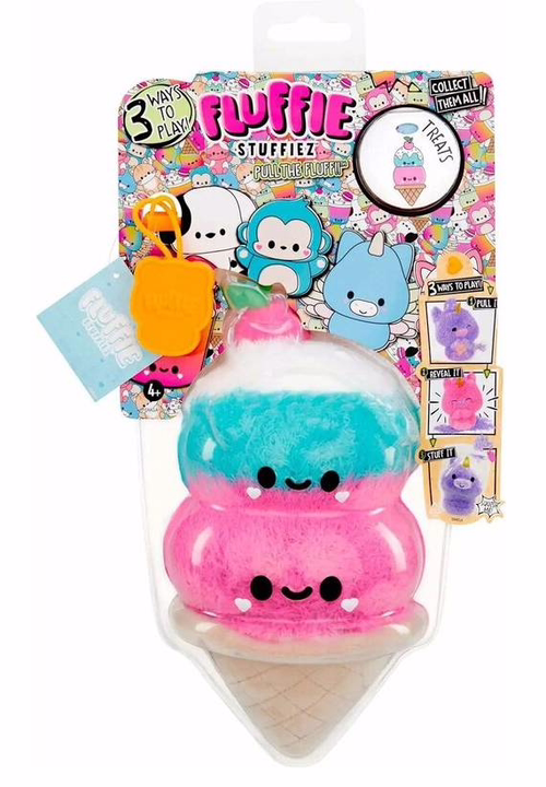 В игровом наборе Флаффи Стаффиз Мороженое Рожок мягконабивная игрушка высотой 20 см со специальным ворсом, который можно выщипать из игрушки, а также особый аксессуар, выполняющий роль чехла для выщипанного ворса. Чехол-упаковку можно открывать и закрывать, чтобы наполнить его снова или распределить цветной ворс по-новому.