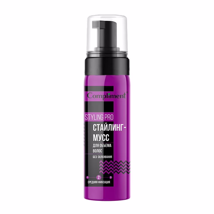 Невесомая формула Стайлинг-мусса из серии Styling Pro от Compliment обеспечит стойкий результат без утяжеления и склеивания волос, и защиту от высоких температур при горячей укладке.