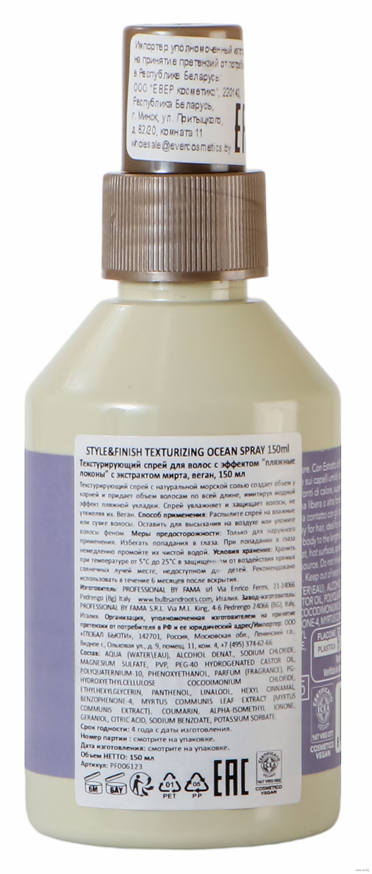Текстурирующий экологически чистый спрей с натуральной морской солью создает объём у корней и придаёт объём волосам по всей длине, имитируя модный эффект пляжной укладки.