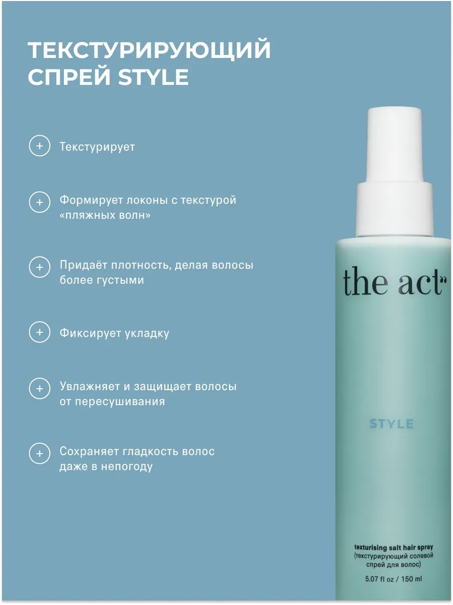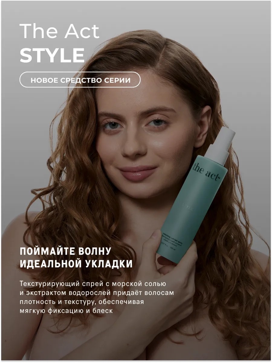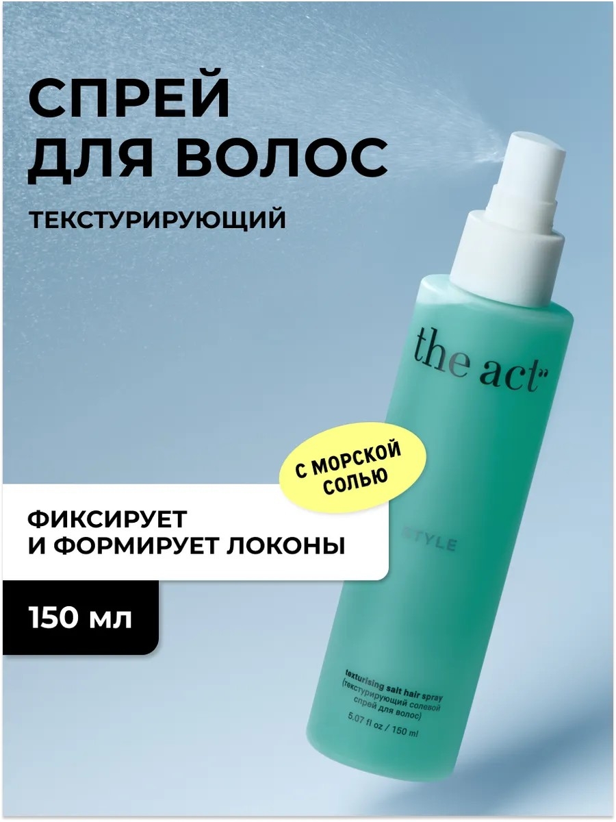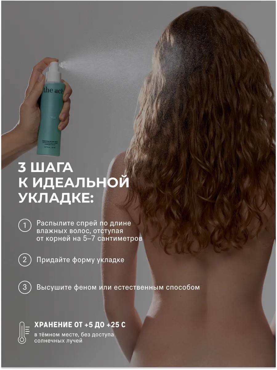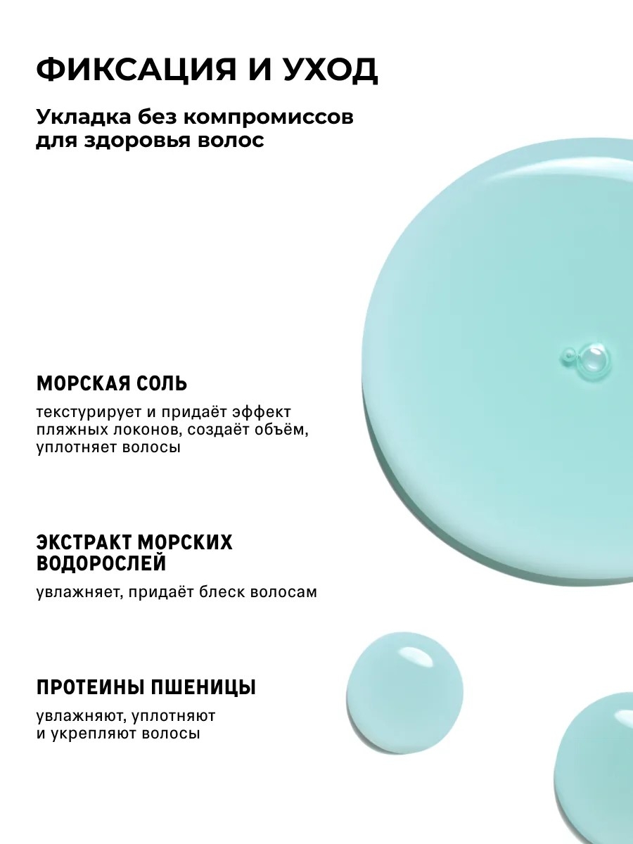 Лёгкий текстурирующий солевой спрей с экстрактами морских водорослей и протеинами увлажняет и уплотняет волосы, придаёт текстуру и подчёркивает естественную волну, обеспечивает фиксацию, не оставляя ощущения липкости.