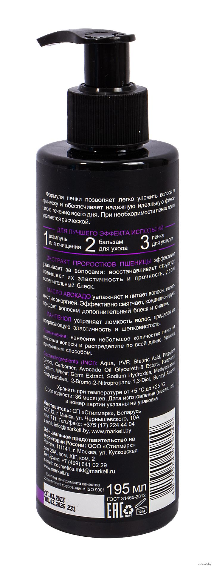 Тщательно встряхните флакон, держите дозатором вниз. Выдавите пенку на ладонь, нанесите на влажные волосы. Моделируйте желаемую форму.Состав