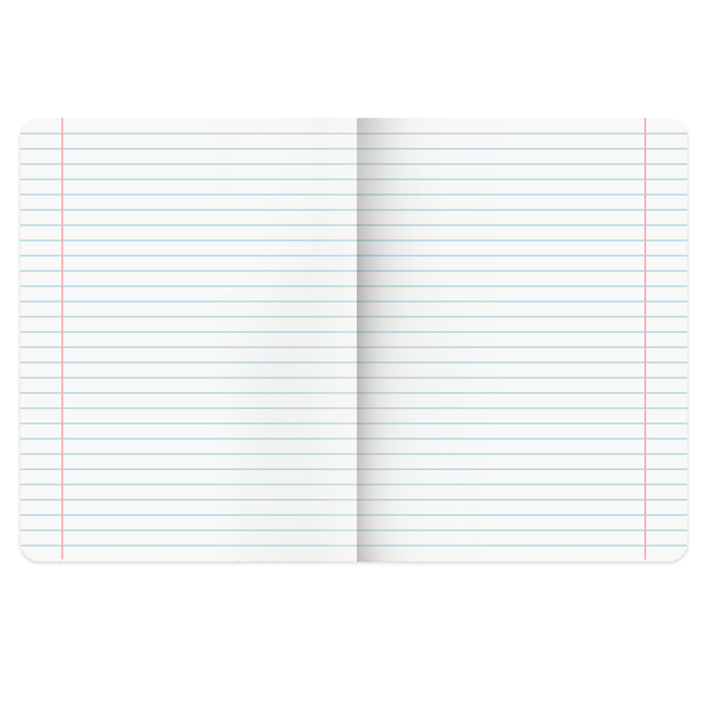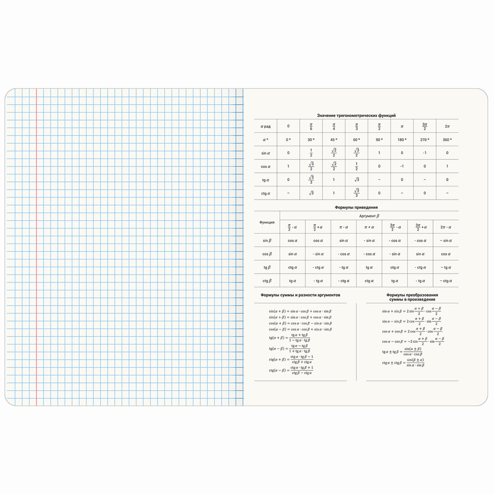 Тетради формата А5 содержат 48 листов, изготовленных из высококачественной офсетной бумаги плотностью 60 г/м2, 100% белизны, с красными полями. Листы соединены скобами.