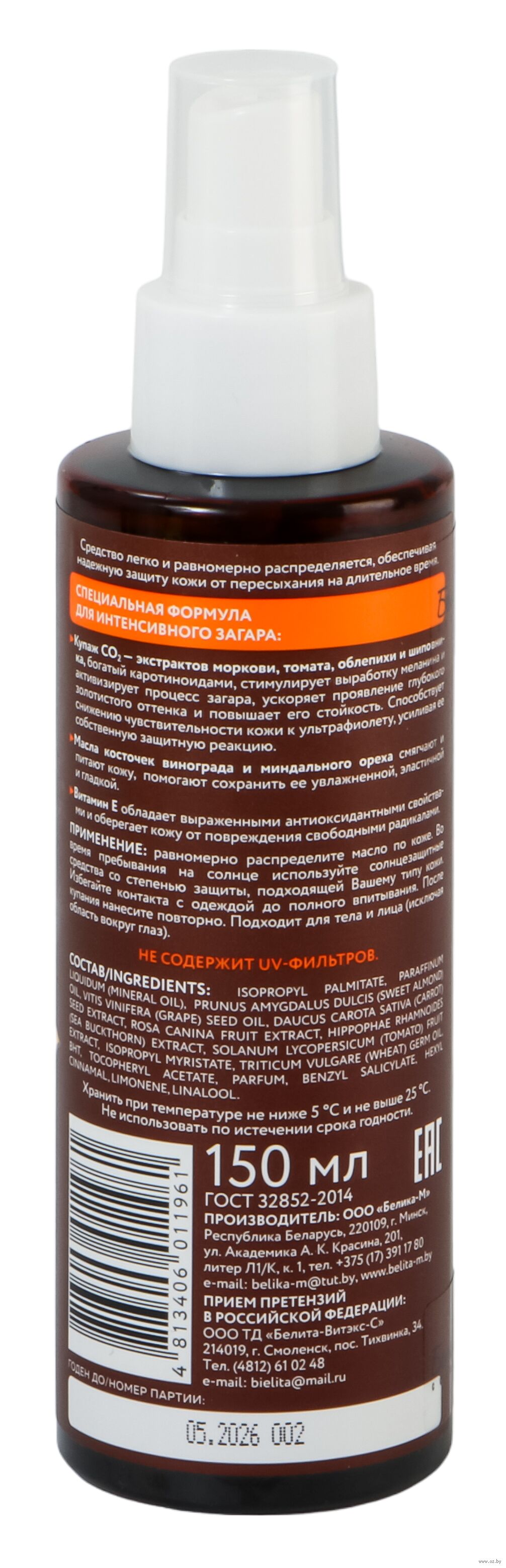 Равномерно распределите масло по коже. Во время пребывания на солнце используйте солнцезащитные средства со степенью защиты, подходящей вашему типу кожи. Избегать контакта с одеждой до полного впитывания. После купания нанести повторно. Подходит для тела и лица (исключая область вокруг глаз).Состав
