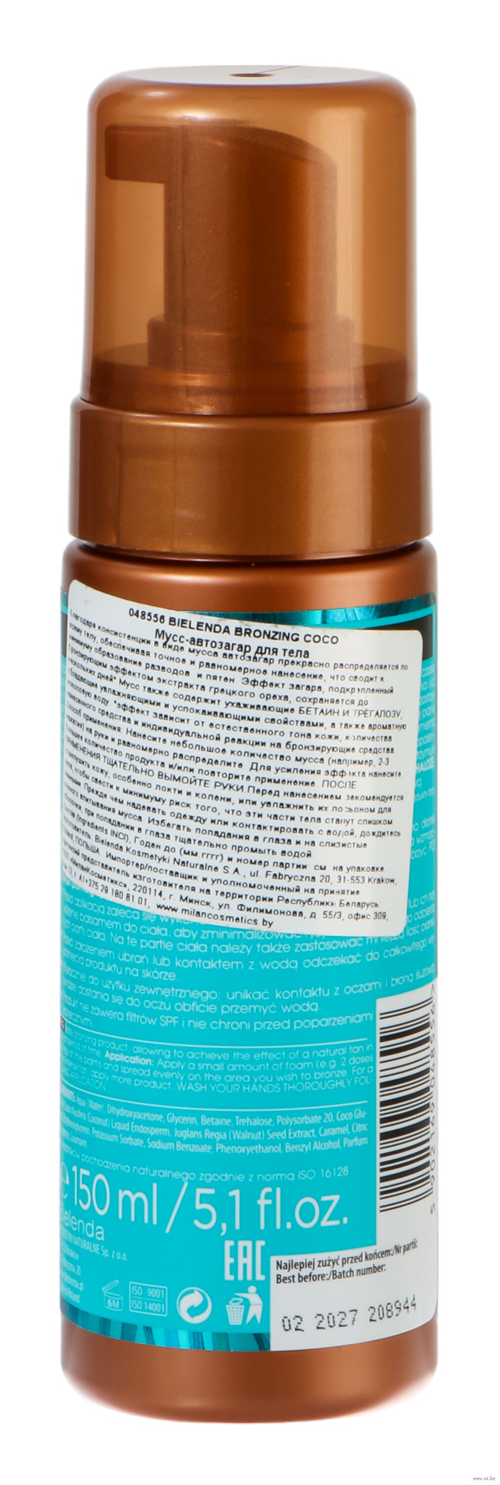 Нежная формула легкой пены идеально распределяется по по всему телу, что обеспечивает точное и равномерное нанесение, что сводит к минимуму образование полос, пятна или пятна. Эффект загара, поддерживаемый бронзирующим эффектом экстракта ореха итальянский сохраняется до нескольких дней. Пена также содержит лелеять ароматная кокосовая вода.
