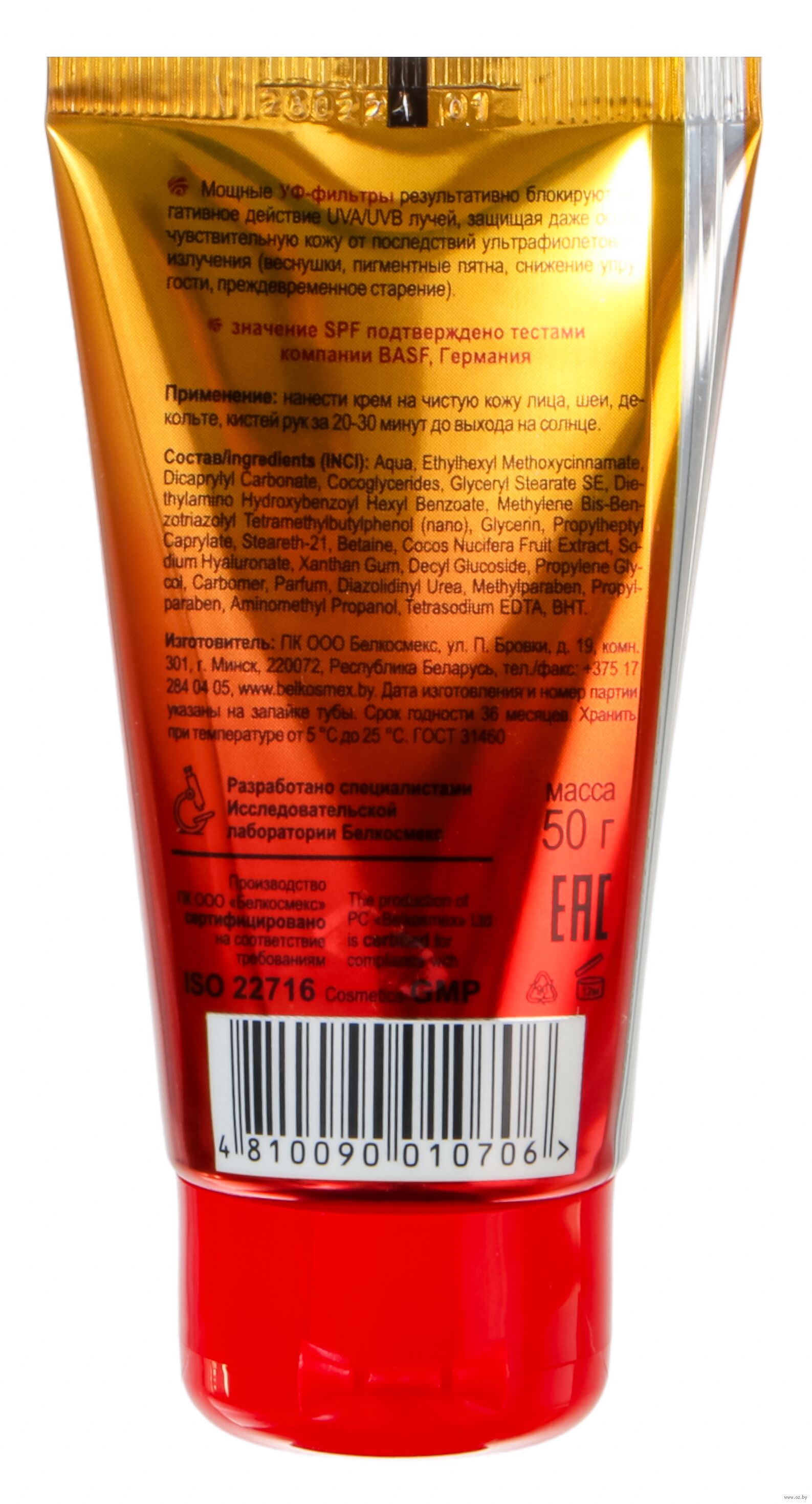 Нанести крем на чистую кожу лица, шеи, декольте, кистей рук за 20-30 минут до выхода на солнце.Состав