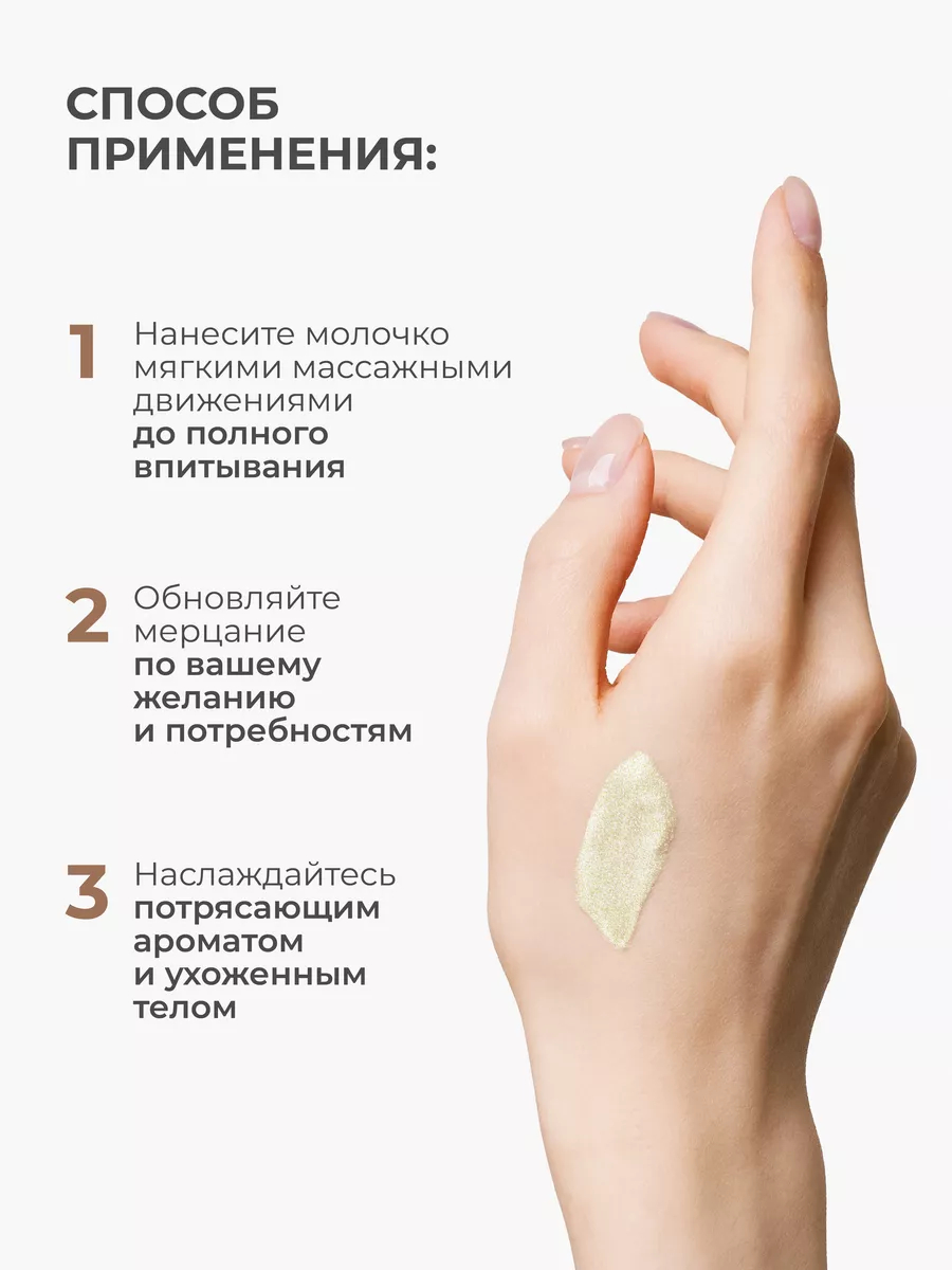 Молочко имеет обогащенную текстуру, которая быстро впитывается, увлажняет и тонизирует. Формирует лёгкий оттенок, выравнивает тон кожи, скрывает мелкие недостатки на теле, не оставляя разводов и пятен, не пачкает одежду, не содержит краску, равномерно сходит.