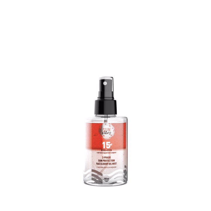 Спрей для лица и тела защищает кожу от солнца благодаря SPF 15, а его двухфазная формула легко наносится и практически не ощущается на коже.