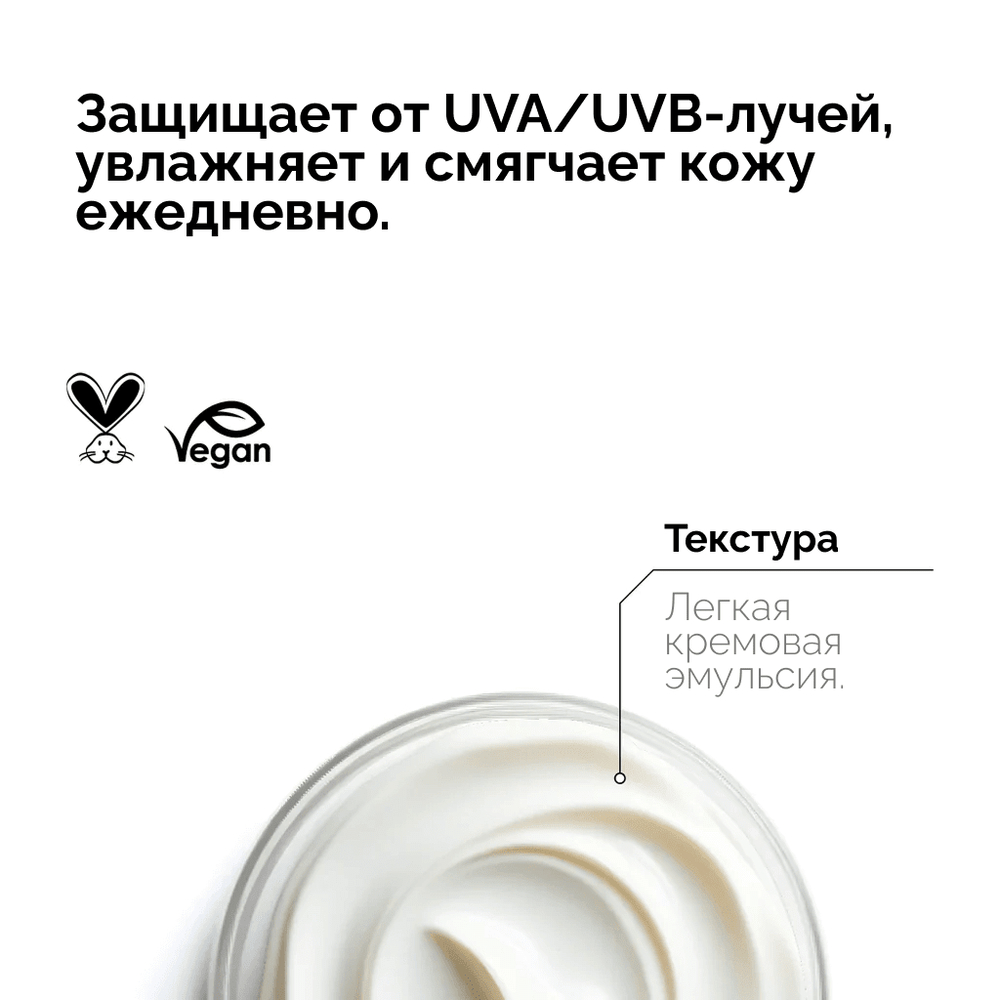 Этот лёгкий крем для ежедневного ухода – универсальное средство. Он защищает кожу от вредного воздействия ультрафиолетовых лучей спектра А, вызывающих старение, и ультрафиолетовых лучей спектра В, вызывающих ожоги, а также увлажняет и смягчает её. Благодаря своей нежной текстуре он быстро впитывается, не оставляя жирного блеска, и создаёт идеальную основу для макияжа. Не сочетать с: прямыми отшелушивающими кислотами.