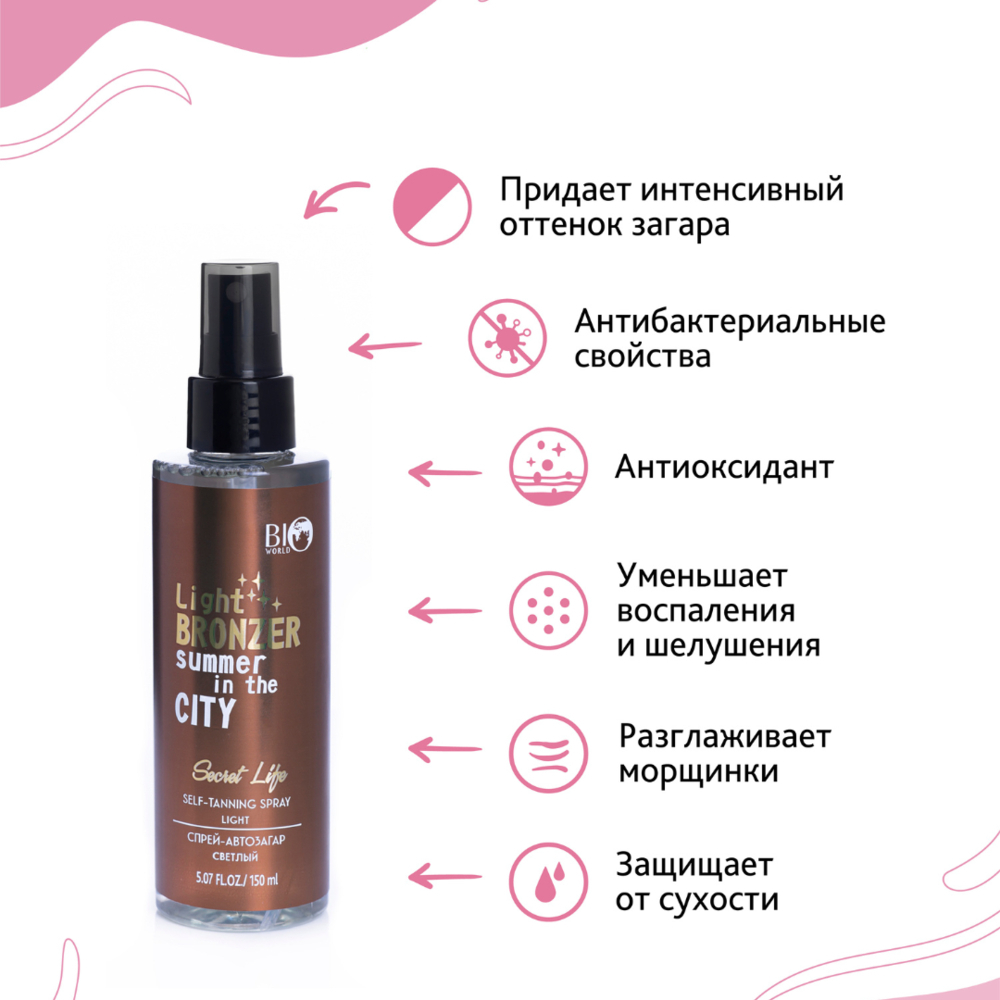 Спрей-автозагар на основе натуральных компонентов, придает коже интенсивный оттенок загара, который сохраняется на протяжении нескольких дней. Спрей дополнительно увлажняет кожу.