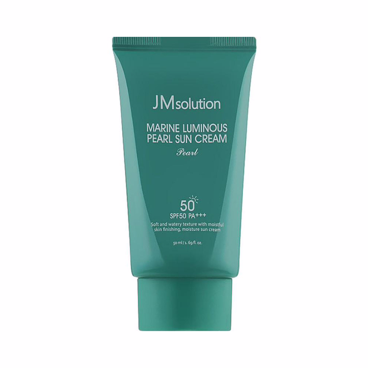 Солнцезащитный крем для лица с жемчугом Marine Luminous Pearl Sun Cream, SPF50+PA++++ JMsolution выравнивает тон, успокаивает воспаления и повышает упругость и эластичность кожи благодаря таким активным компонентам как экстракты морских водорослей, ламинарии, жемчужному экстракту, морскому коллагену и трем видам гиалуроновой кислоты.
