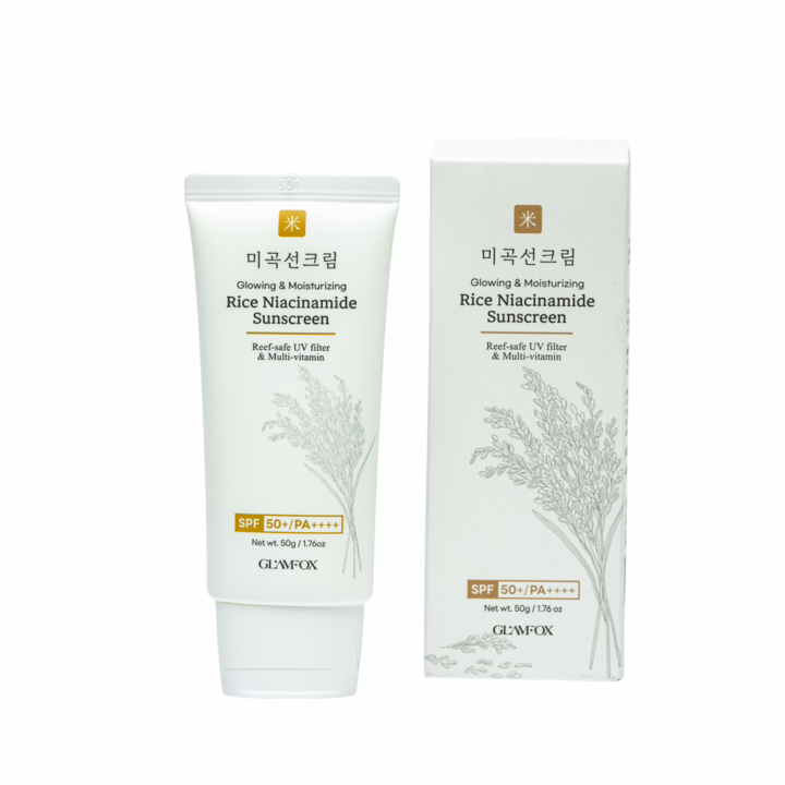 GLAMFOX "Rice Niacinamide Sunscreen" представляет собой инновационный солнцезащитный крем с широким спектром защиты SPF 50, основанный на рисовых экстрактах и ферментах для комплексного ухода.