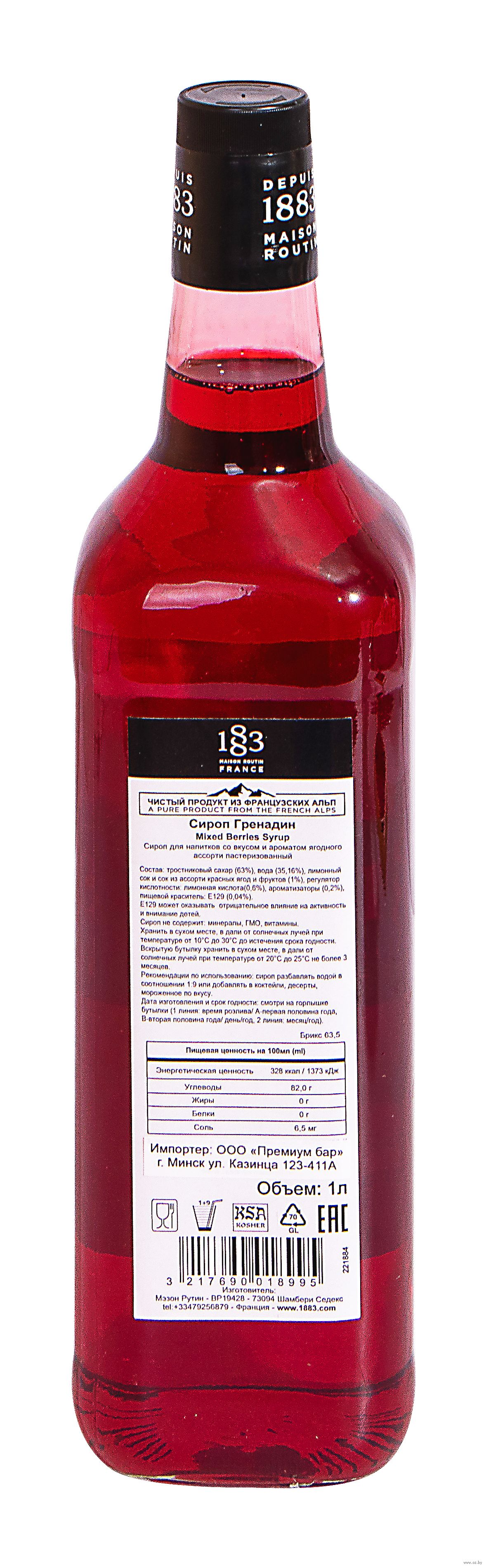 Стоит отметить, что современный рецепт подсластителя включает в себя не только гранат, а сбалансированное сочетание его и различных ягод, в первую очередь красной и черной смородины, клубники и малины. "1883" также обеспечивает натуральность состава, ведь в него входит тростниковый сахар, очищенная альпийская вода, натуральные концентрированные соки, а также безопасные пищевые добавки и ароматизаторы. Качество продукции подтверждено мировыми сертификатами, при этом цена сиропа остается доступной для широкого потребителя.