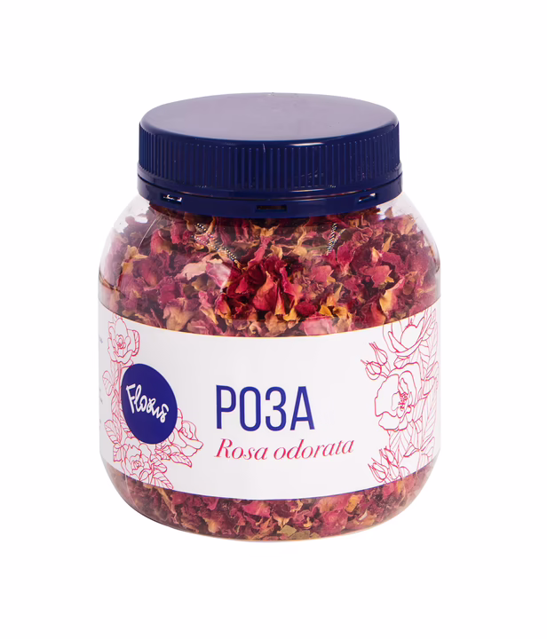 В прозрачной баночке сушеные цветки Розы чайной (Rosa odorata), произрастающей у подножья крымских гор. Сорт известен сладким ароматом и мягким вкусом. Хорошо сочетается с чёрным и зелёным чаем. Можно заваривать как монопозицию. Чайная роза помогает восстановить защитные функции, нормализовать сон и улучшить работу пищеварения.