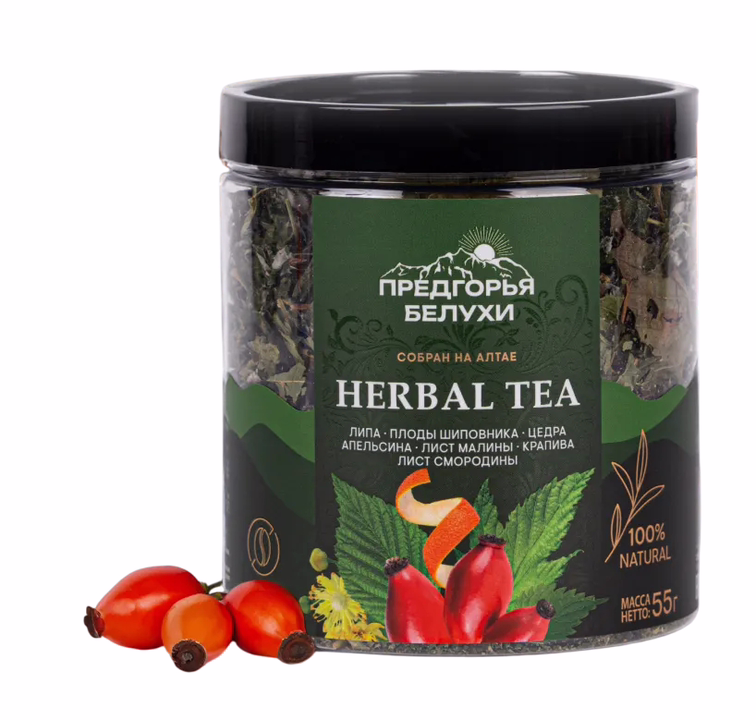 Травяной чай "Предгорья Белухи" богат витаминами С, K, P, макро- и микроэлементами. Он повышает иммунитет, бодрит и наполняет энергией.