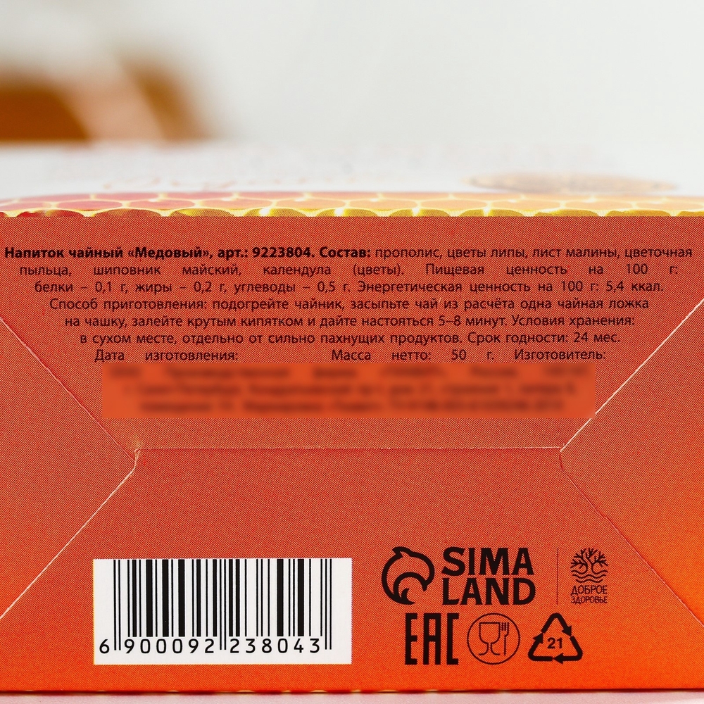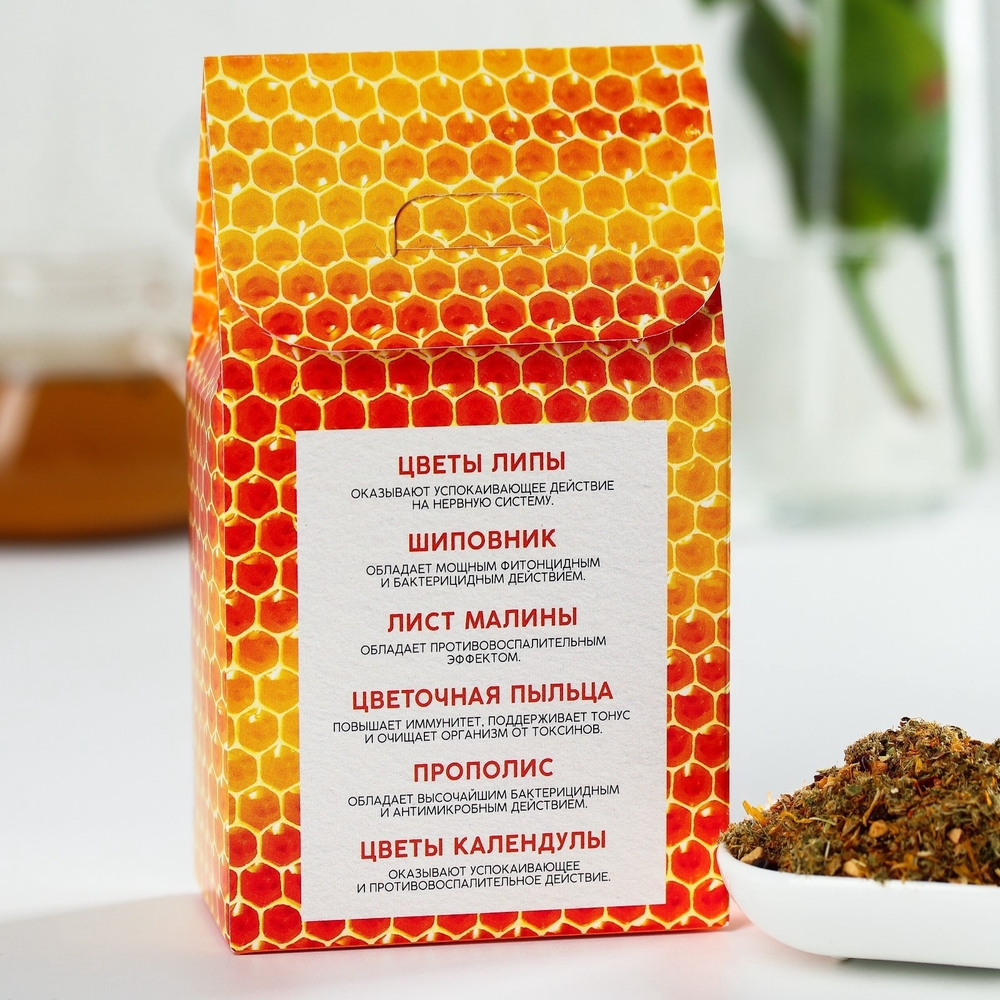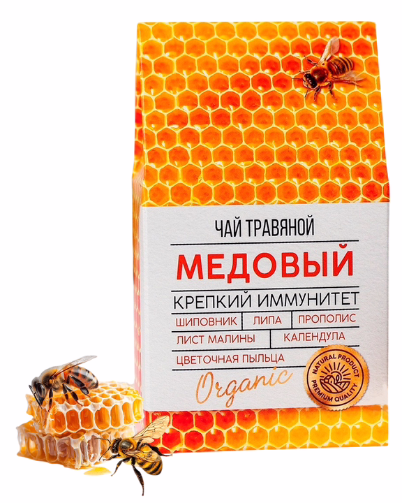 Ягодно-травяной чай "Медовый": цветы липы, шиповник, лист малины, цветочная пыльца, прополис, цветы календулы.