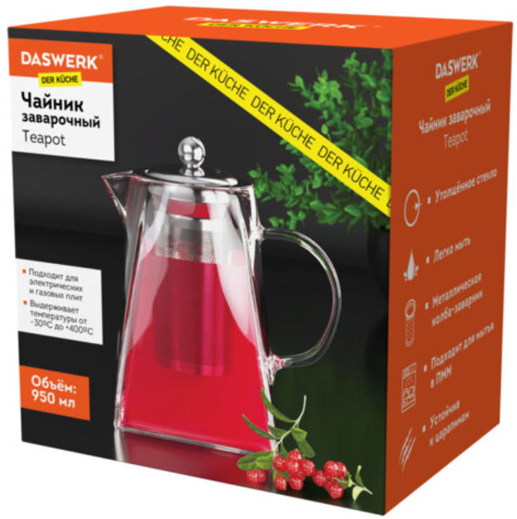 Чайник заварочный стеклянный DASWERK подойдет для заваривания чая и приготовления холодных напитков. Прекрасно впишется в любой интерьер кухни – от современного до классического стиля. Станет отличным подарком для родных и близких.