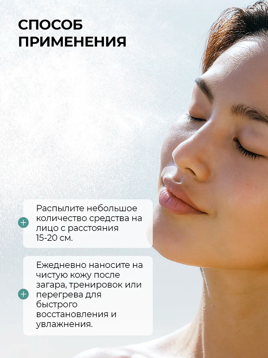 Спрей-мист подходит для всех типов кожи и станет незаменимым спутником в уходе. Просто распылите спрей на лицо с расстояния и ощутите мгновенное облегчение и комфорт.
