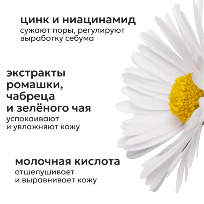 Aqua, Niacinamide (витамин В3), Glycerin, Sodium Salicylate (натриевая соль салициловой кислоты), Potassium Azeloyl Diglycinate (азелоглицин), Betaine (бетаин), PEG-40 Hydrogenated Castor Oil, Chamomilla Recutita Flower Extract (экстракт ромашки), Melissa Officinalis (Lemon Balm) Leaf Extract (экстракт листьев мелисы), Thymus Serpyllum Leaf (Wild Thyme) Extract (экстракт чабреца), Equisetum Arvense Leaf (экстракт листьев полевого хвоща), Achillea Millefolium (Common Yarrow) Extract (экстракт тысячелистника), Ononis Spinosa (Spiny Rest Harrow) Root Extract (экстракт стальника колючего), Althaea Officinalis Root Extract (экстракт корня лекарственного алтея), Propylene Glycol, Camellia Sinensis (Green Tea) Leaf Water (гидролат зелёного чая), Lactic Acid (молочная кислота), Zinc PCA (цинк PCA), Hydroxyethylcellulose, Parfum, Benzyl Alcohol, Benzoic Acid, Dehydroacetic Acid, Sodium Hydroxide.Мы используем файлы cookie для обеспечения удобства работы с сайтом и его контакта с пользователем.