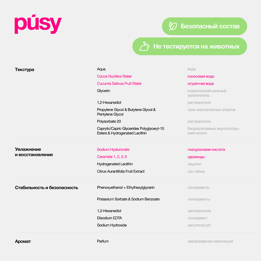 Aqua, Cocos Nucifera Water, Cucumis Sativus Fruit Water, 1,2-Hexanediol, Propylene glycol, Glycerin, Biosaccharide Gum-1, Polysorbate 20, Sodium Hyaluronate, Disodium EDTA, Ethylhexylglycerin, Phenoxyethanol, Ceramide 1, Ceramide 2, Ceramide 3, Ceramide 6 Il, Butylene Glycol, Hydrogenated Lecithin, Caprylic/Capric Glycerides Polyglyceryl-10 Esters, Pentylene Glycol, Citrus Aurantifolia Fruit Extract, Potassium sorbate, Sodium benzoate, Sodium Hydroxide, Parfum.Мы используем файлы cookie для обеспечения удобства работы с сайтом и его контакта с пользователем.