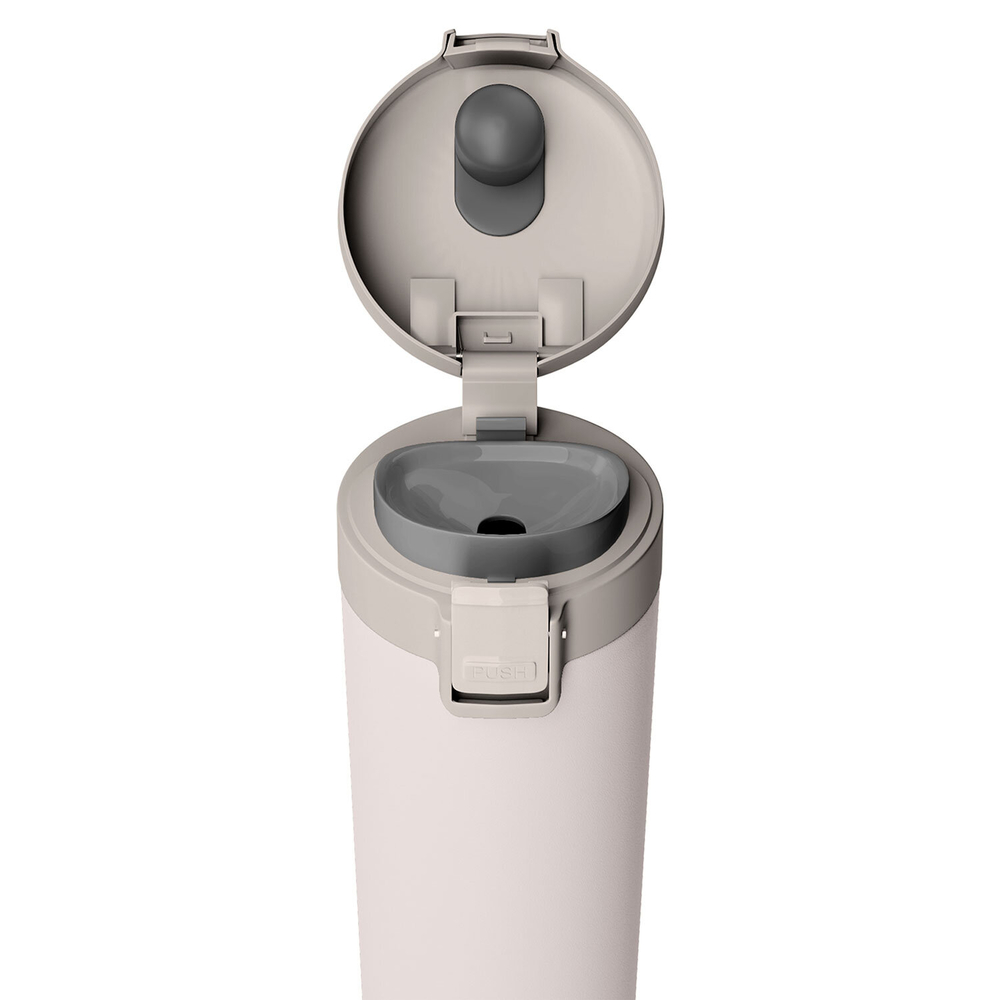 Эргономичная форма и оптимальный вес термокружки делают её идеальной для ежедневного использования: она легко помещается в сумку или автомобильный подстаканник. Герметичная система исключает случайные проливания, а эргономичный питейник обеспечивает комфортное питьё без необходимости снимать крышку. Корпус термокружки снабжен многофункциональной кнопкой, которая позволяет одним движением открывать, блокировать и разблокировать крышку, делая использование максимально удобным.