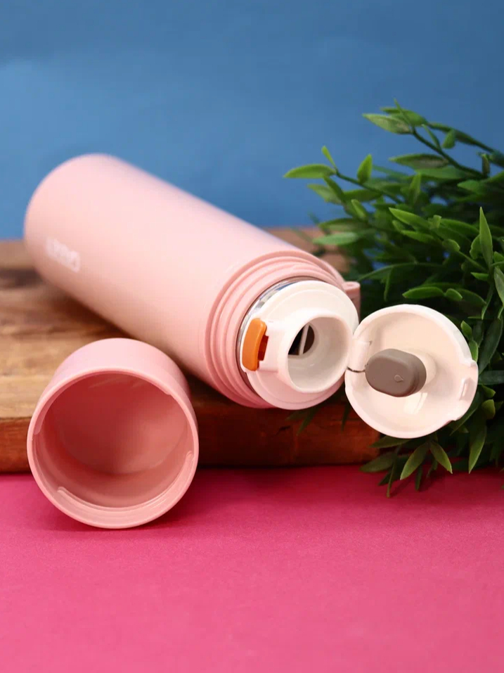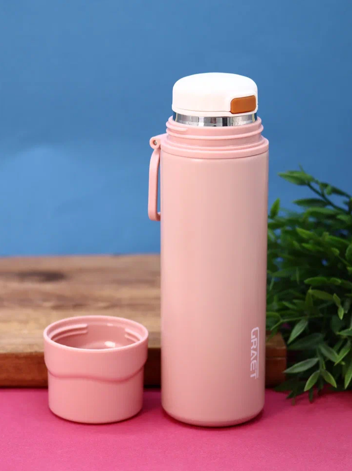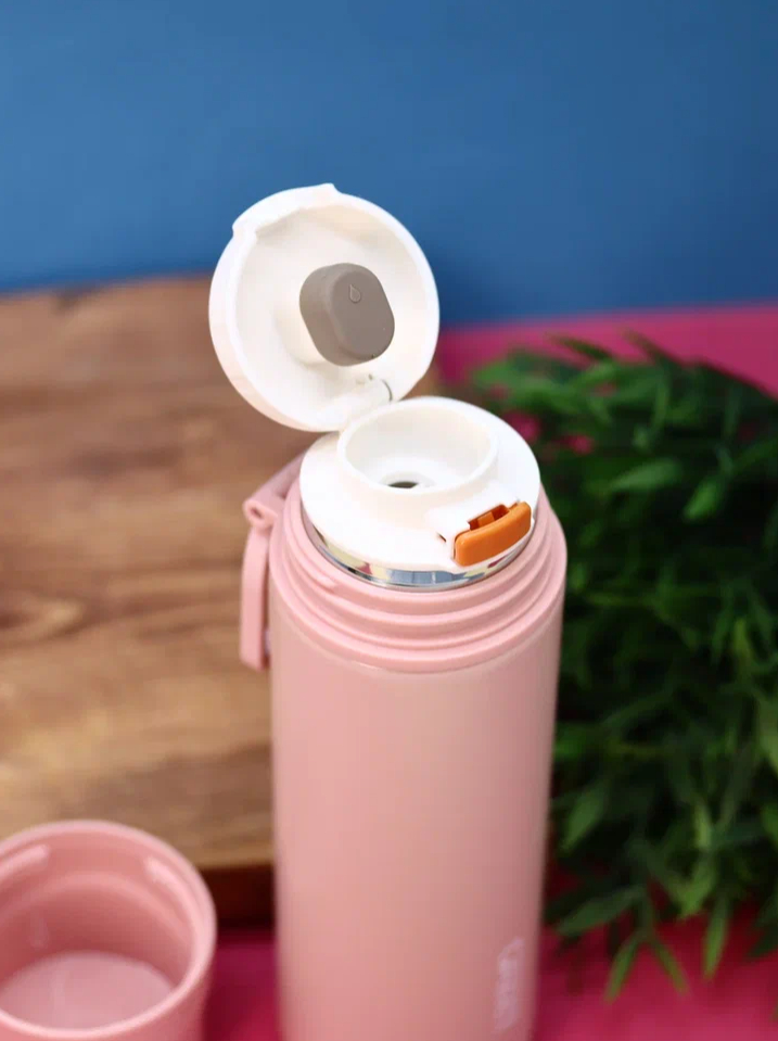 Термос изготовлен из высококачественной нержавеющей стали. Вакуум в межстеночном пространстве колбы и корпуса обеспечивает теплоизолирующие свойства, которые позволяют сохранять температуру 5-6 часов. Отлично подойдёт для хранения горячих и холодных напитков. Отвинчивающаяся крышка, которую можно использовать как стакан, и горлышко термоса выполнены из пластика.