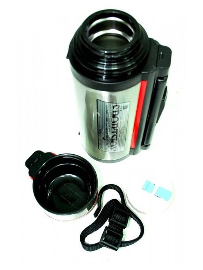 Двойные стенки, пробка винтовая, дополнительная пластиковая чашка, удобная ручка, ремень, диаметр горлышка – 6 см.