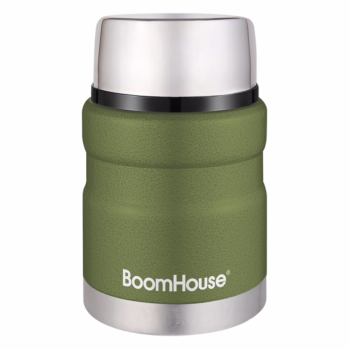 Корпус термоса BoomHouse покрыт молотковым покрытием оливкового цвета, которое не только обеспечивает термосу стильный дизайн, но и препятствует появлению мелких царапин при долгосрочном использовании. Глухая винтовая пробка с качественным уплотнителем и термоизоляцией гарантирует герметичность и помогает дольше сохранять температуру.