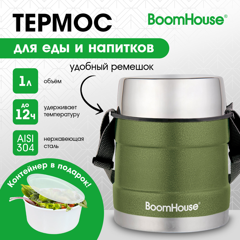 Корпус термоса BoomHouse покрыт молотковым покрытием оливкового цвета, которое не только обеспечивает термосу стильный дизайн, но и препятствует появлению мелких царапин при долгосрочном использовании. Термос снабжен удобным ремешком, регулируемым по длине. В комплекте с термосом поставляется пластиковый контейнер с крышкой. Благодаря диаметру горлышка в 10,5 см можно есть прямо из термоса.Термос имеет высоту 15,9 см, диаметр донышка – 12,7 см.