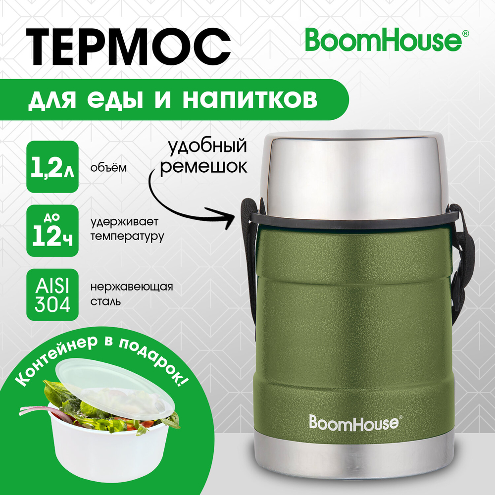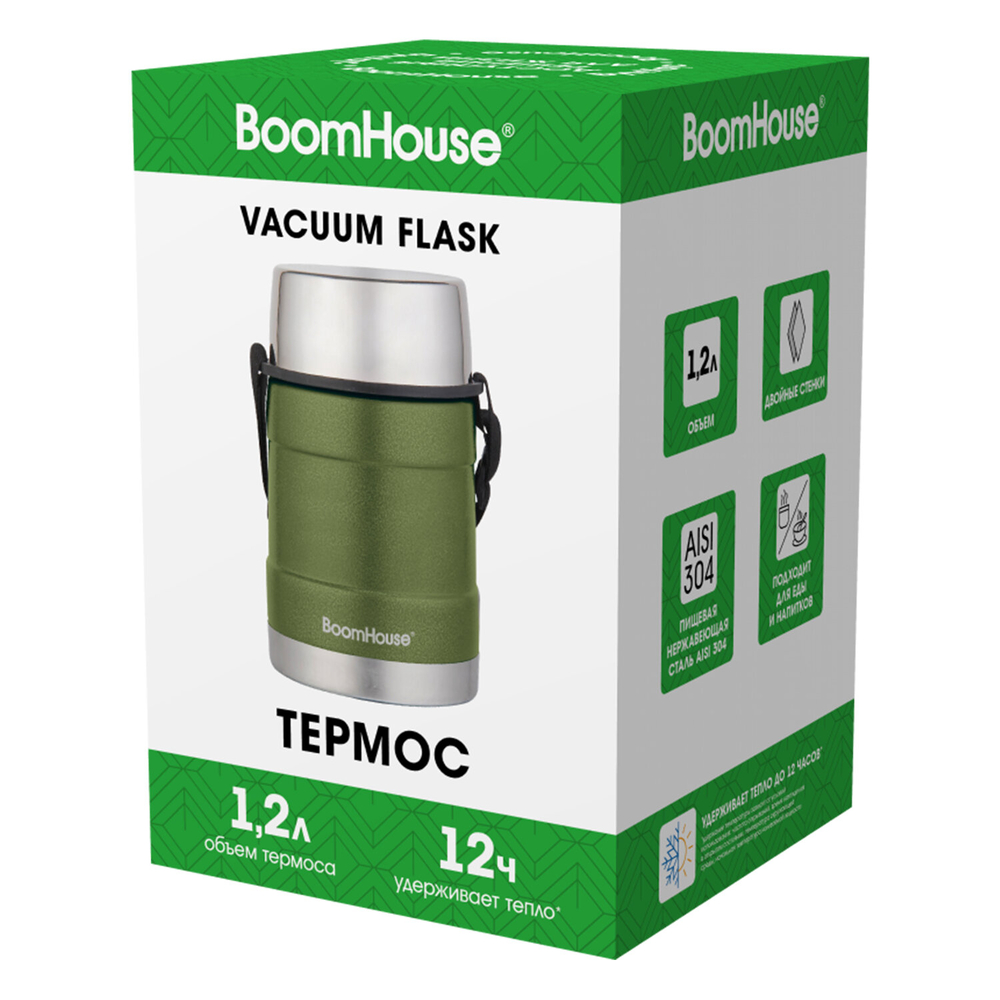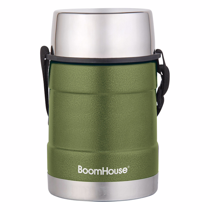 Корпус термоса BoomHouse покрыт молотковым покрытием оливкового цвета, которое не только обеспечивает термосу стильный дизайн, но и препятствует появлению мелких царапин при долгосрочном использовании. Термос снабжен удобным ремешком, регулируемым по длине. В комплекте с термосом поставляется пластиковый контейнер с крышкой. Благодаря диаметру горлышка в 10,5 см можно есть прямо из термоса.Термос имеет высоту 18,1 см, диаметр донышка – 12,7 см.