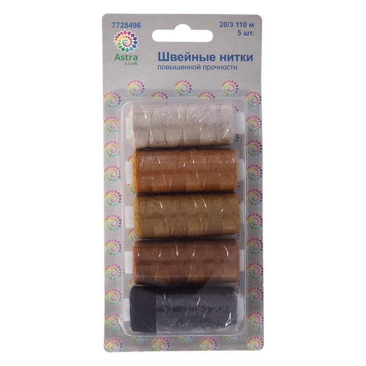 Набор ниток Astra №20/3. Нитки изготовлены из 100% полиэстера, прочные на разрыв и слегка эластичные, равномерные по толщине. Обеспечивают ровный и надежный шов. Не теряют цвет после многократных стирок и от воздействия ультрафиолетовых лучей.