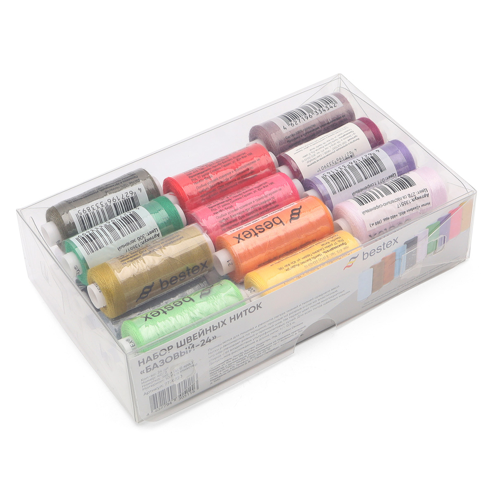 Набор ниток Bestex "Базовый №40/2" – прекрасный вариант для шитья, ремонта текстильных изделий, рукоделия. Подойдут для бытовых и промышленных швейных машин. Изготовлены из 100 % полиэстера, прочные на разрыв и слегка эластичные, равномерные по толщине, имеют правостороннюю крутку. Обработаны силиконом на 3%, поэтому меньше разрываются при работе на высоких скоростях. Не истончаются и не теряют цвет после многократных стирок и от воздействия ультрафиолетовых лучей. Усадка минимальна, ворс и узелки почти не выражены.