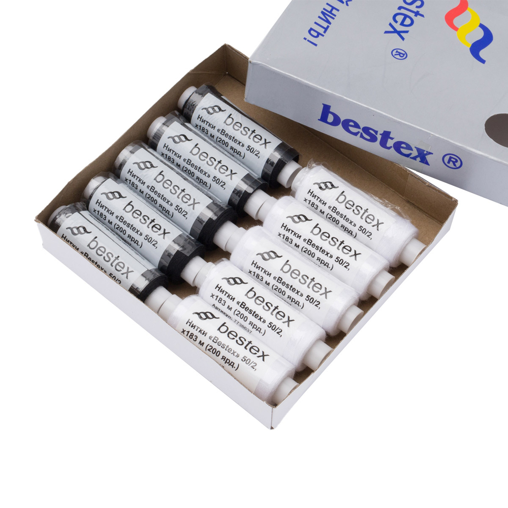 Нитки для шитья 50/2 Bestex в наборе – универсальный выбор для шитья изделий из тонких тканей и тканей средней плотности, от деликатного нижнего белья до трикотажных вещей и оверлочных швов.