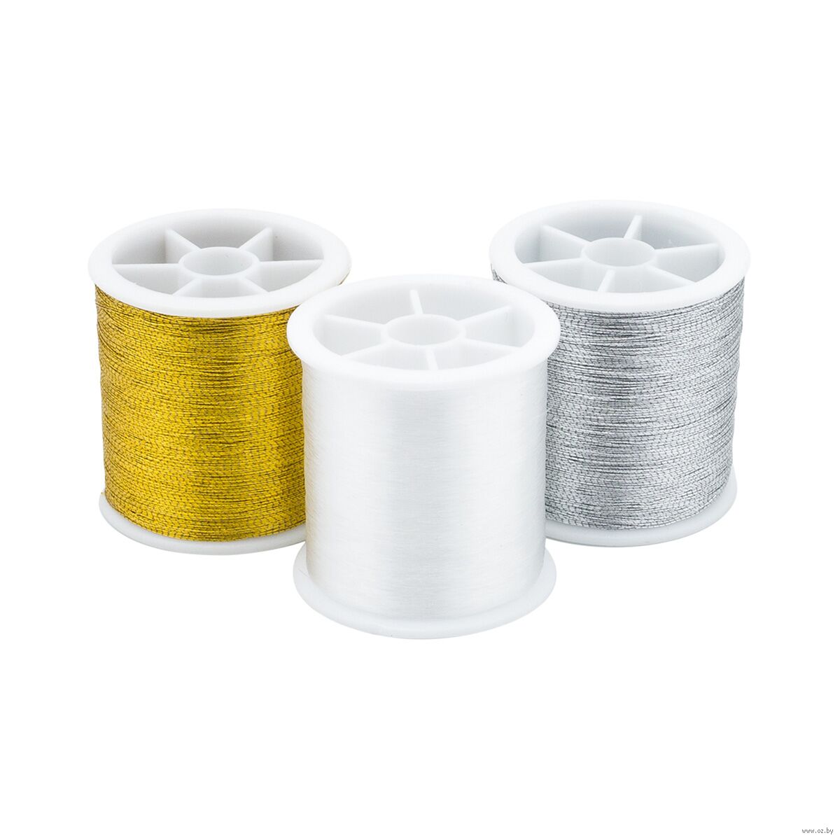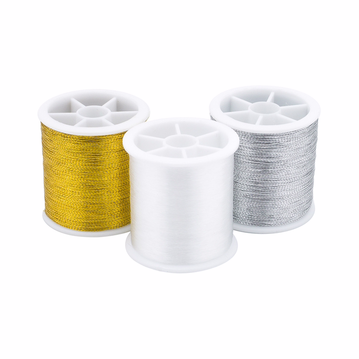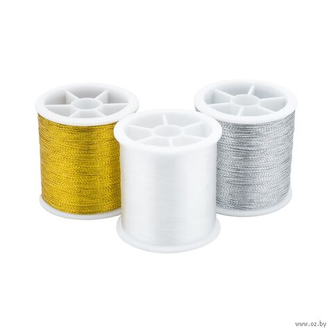 В набор входят: нить металлизированная цвет золотой (1 шт.), нить металлизированная цвет серебряный (1 шт.), мононить белая (1 шт.).