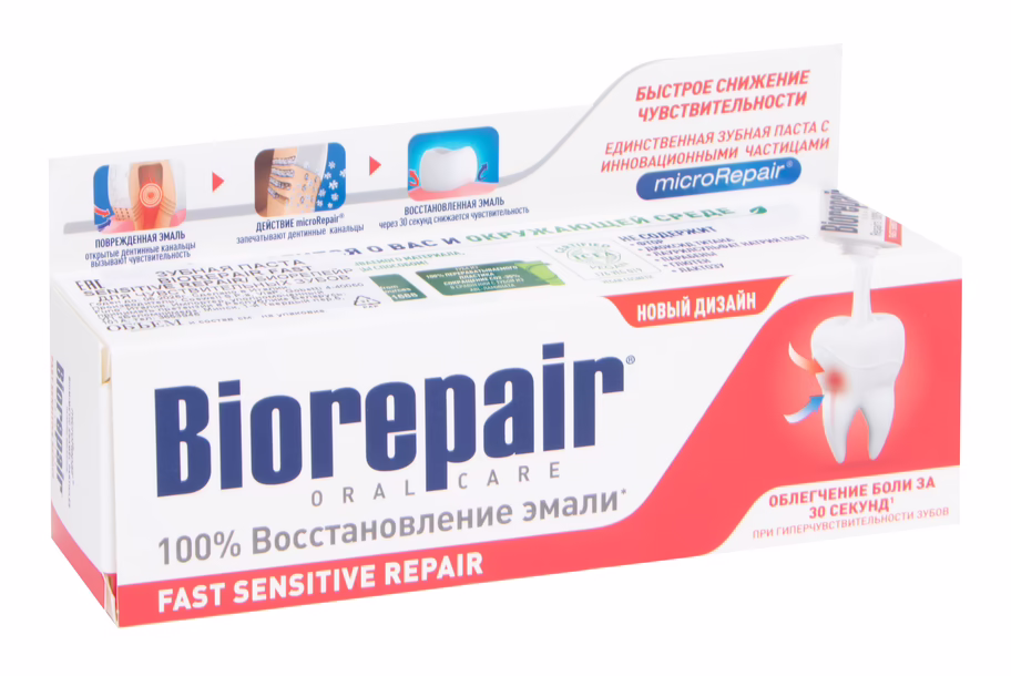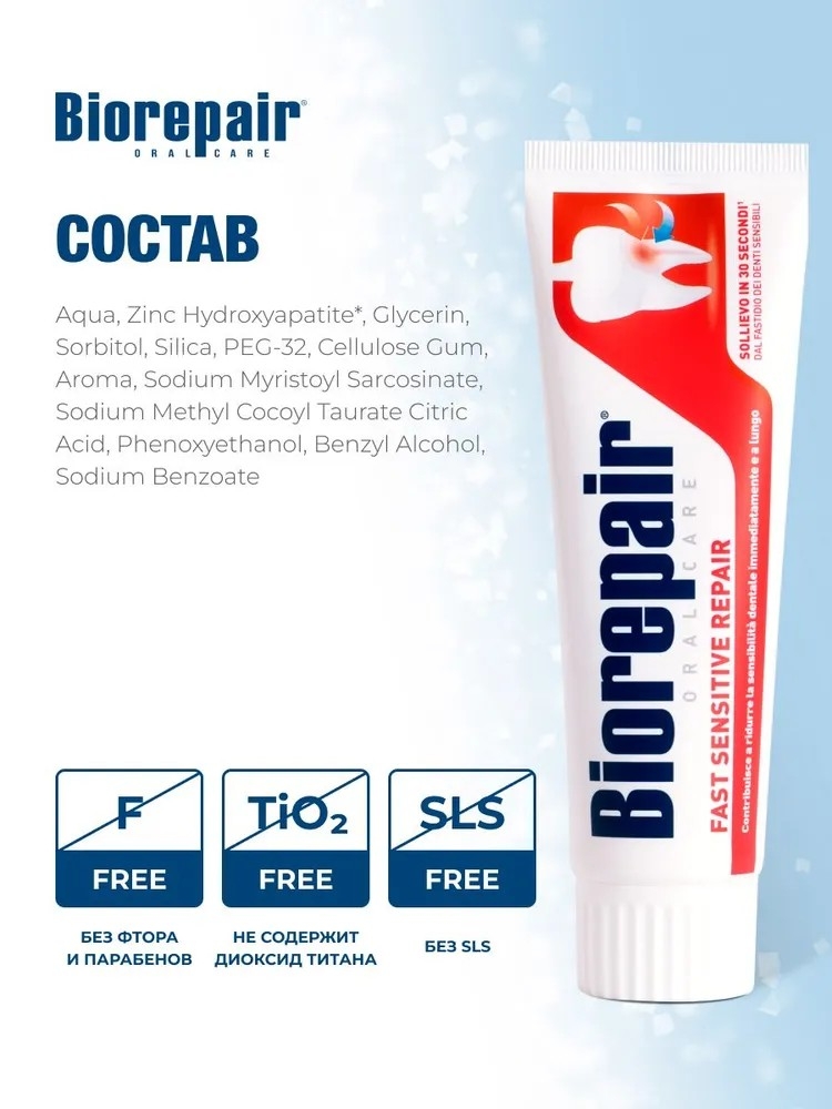 Зубная паста "Для чувствительных зубов" содержит на 60% больше частиц "Microrepair" чем оригинальный "Biorepair". Паста разработана в сотрудничестве с LEBSC (Лаборатория экологической и биологической структурной химии) в университете Болоньи, Италия.